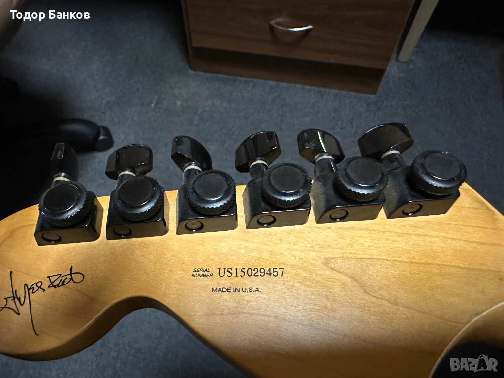 Продавам китара "Fender Jim Root Stratocaster". Китарата има следи от употреба и съм се постарал да снимам всичко, но стои и не се ползва. Продава с твърд кейс туид, колан Фендер със страплокове. Възможен е лек коментар на цената. Моля, не ми предлагайте бартери, защото са ми необходими средства за закупуване на друго. Цената е 1400 евро.