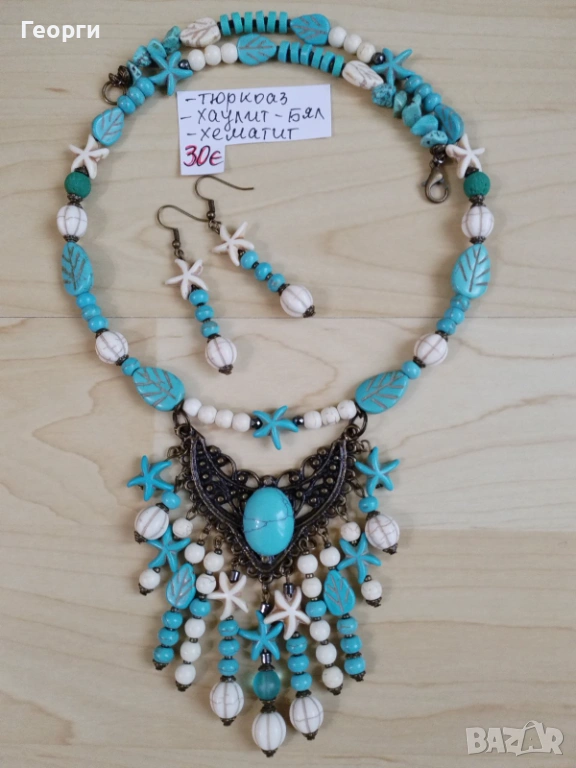 Впечатляващо ръчно изработено колие в морски стил, вдъхновено от океана и лятното настроение. Красивият тюркоазен акцент в комбинация с бели и морски елементи създава свежа, бохо визия, която веднага привлича погледа.