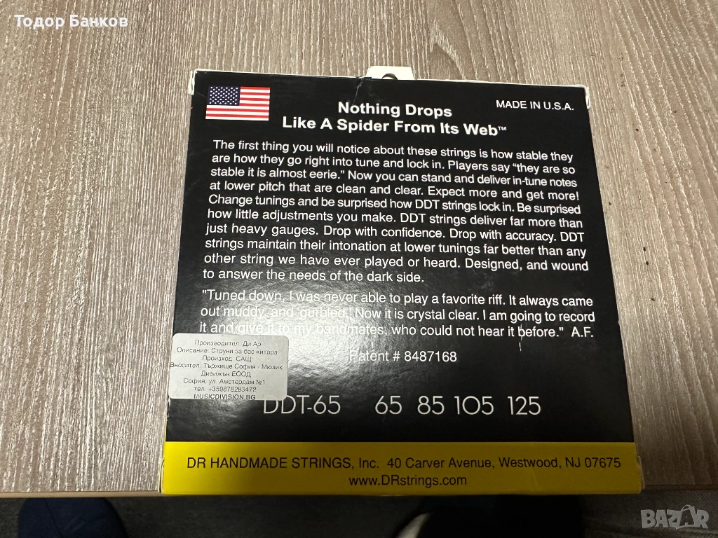 Продавам струни за бас DR Strings Drop-Down Tuning DDT-65. Цената е 30 евро.