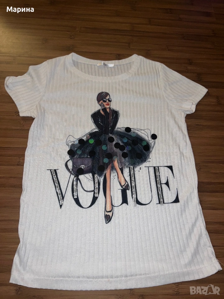 Vogue бяла тениска за жени с дама върху нея → Обява 53541344