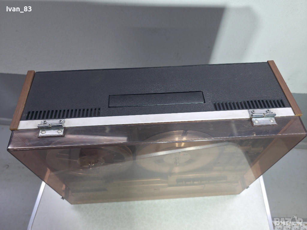 Ролков магнетофон с три мотора и две глави, четири пистов със три скорости. Има нужда от нови ремъци - мъчи се и изключва на плей и превъртане. Индикаторите работят. Внесен от Германия без ремонти и опити за отремонтиране.