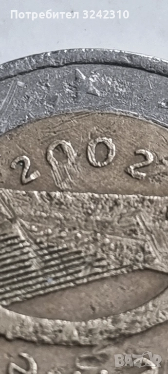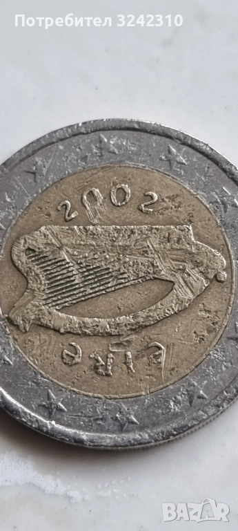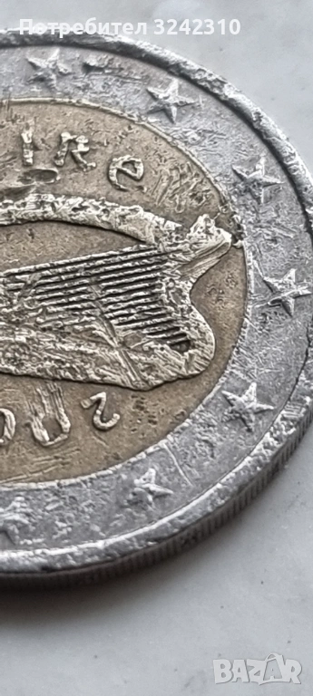 Монета от 2 евро на Ирландия, 2002 г Ирландия 2002 г., уникална колекционерска монета с много разлики между двете държави в сравнение с монетите в обикновена циркулация.