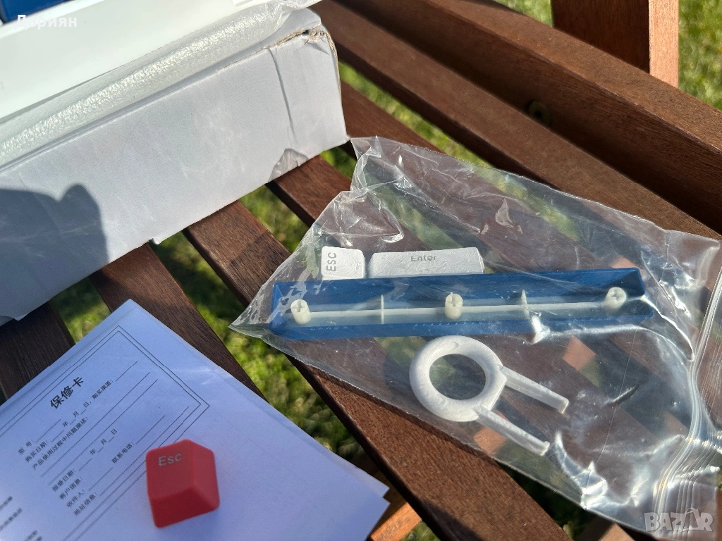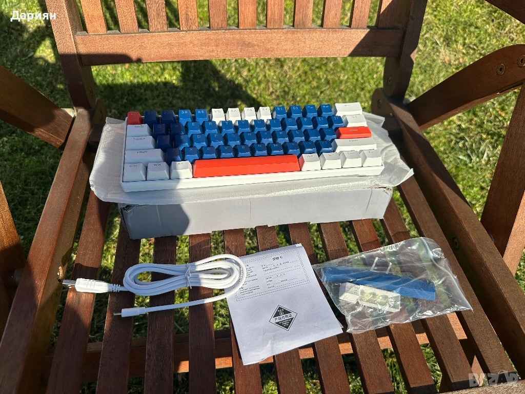 Клавиатурата е чисто нова, с Cherry MX Blue switch-ове е и има прекрасен звук. Идва пълен комплект който съдържа, кабел, капачки, инструмент за махане на капачки и упътване за използване.