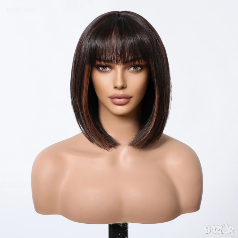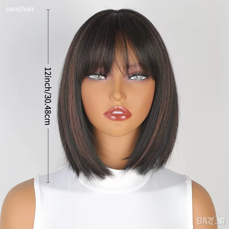 Стилна и модерна къса перука тип каре с дължина 30 см, в наситено черен цвят със светли контрастни кичури. Моделът е с прав бретон, който красиво рамкира лицето и придава изразителна визия.