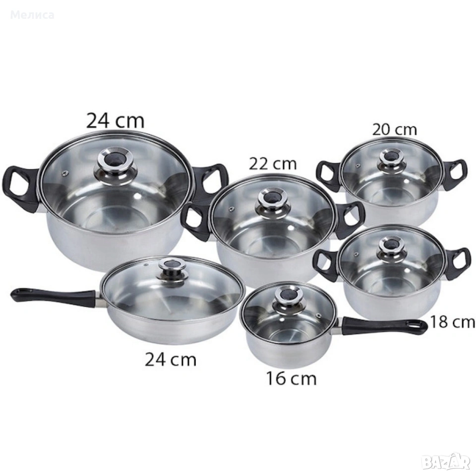 Комплект готварски съдове от инокс 12 части: 5 тенджери, тиган и стъклени капаци (16-24 см) → Обява 53541695