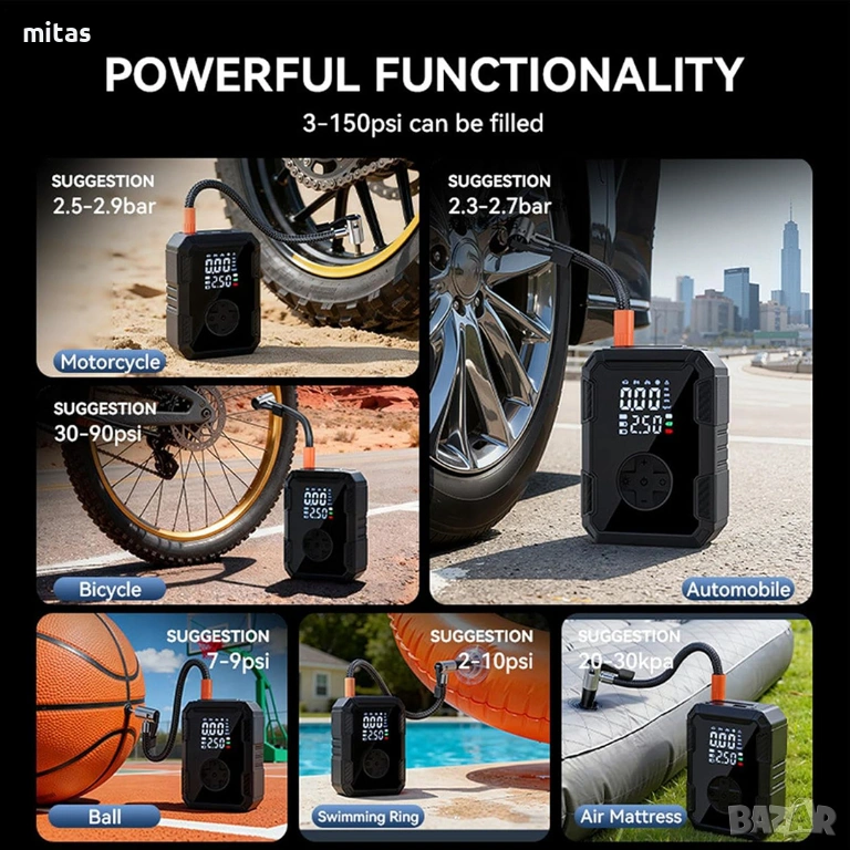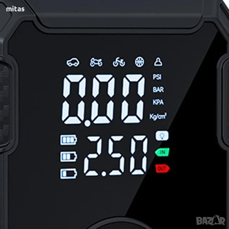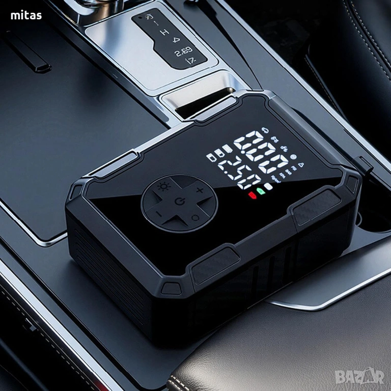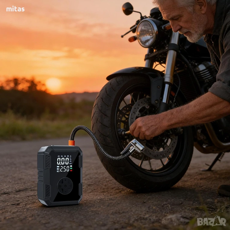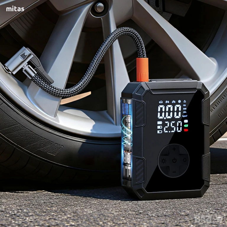 - Готовност за спешни ситуации: Компактният размер и мощната батерия гарантират, че сте винаги подготвени за неочаквани проблеми с гумите, където и да се намирате.