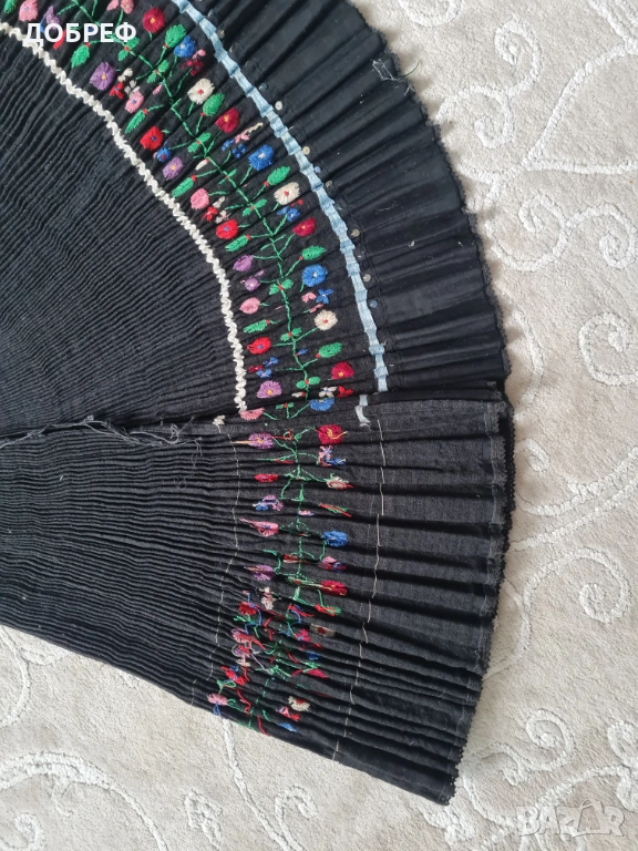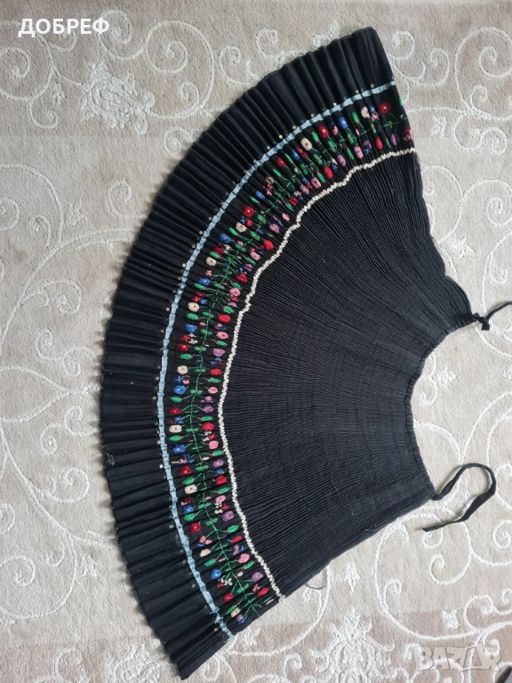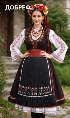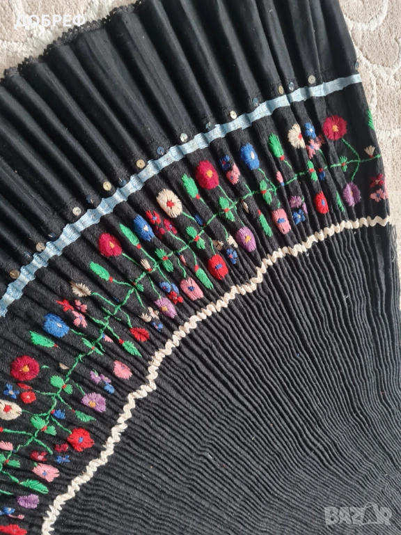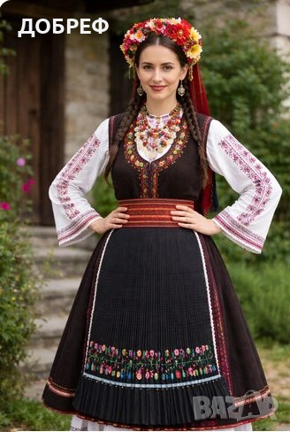 българска народна носия – по-точно престилка/саиче (тип сукманова престилка) с богата цветна шевица. Черен