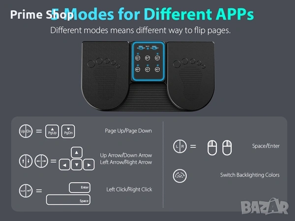 * Пет различни режима на работа, симулиращи функции на мишка и клавиатура, за максимална съвместимост с разнообразни приложения (като OnSong, piaScore и други).