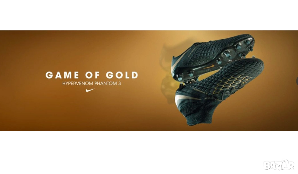 Nike Hypervenom Phantom 3 Club FG от серията „Game of Gold“. Този модел е в цветова комбинация „Черен/Златист“ (Black/Metallic Vivid Gold).