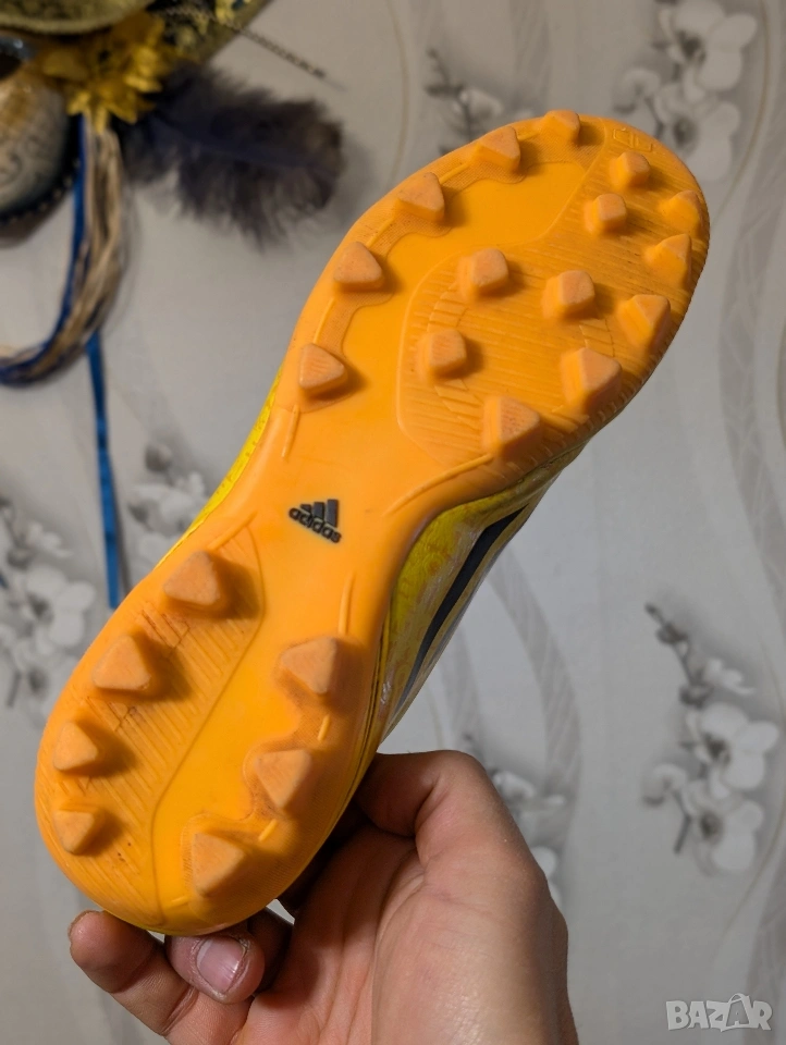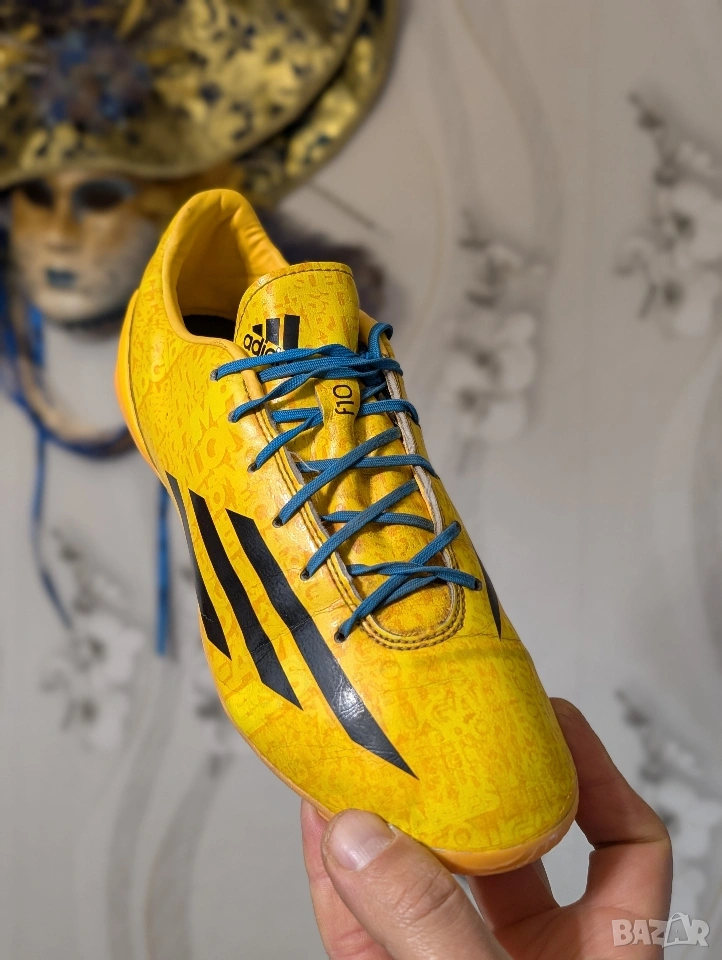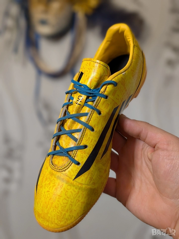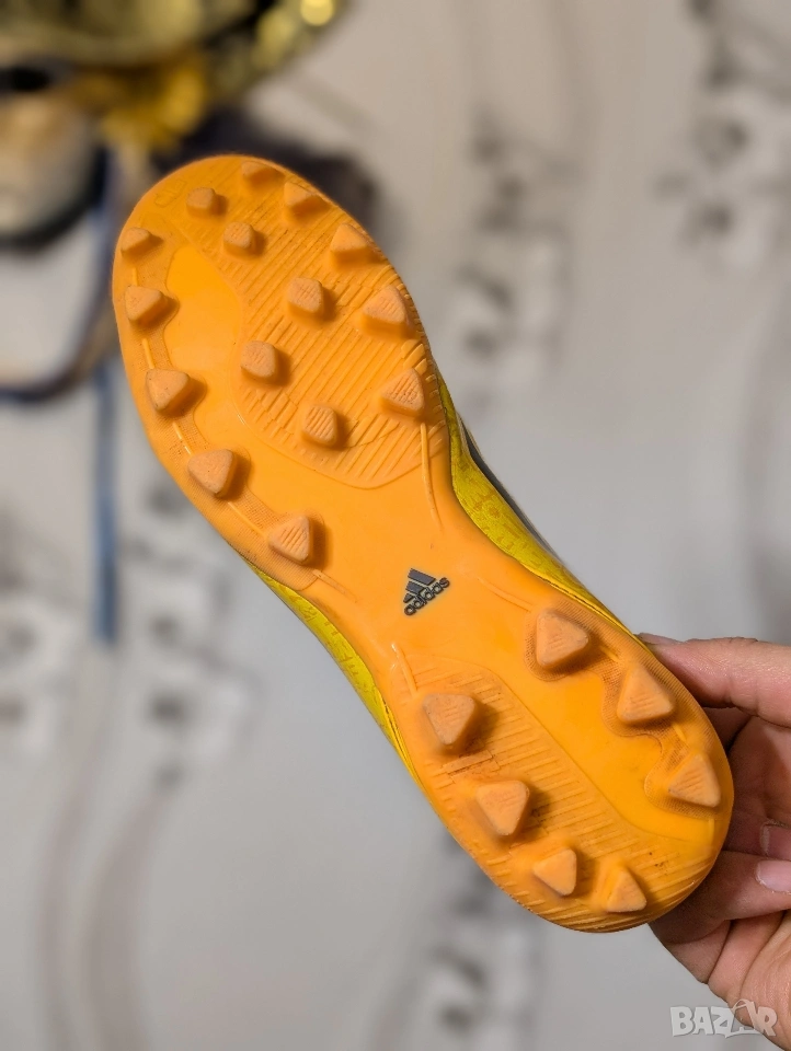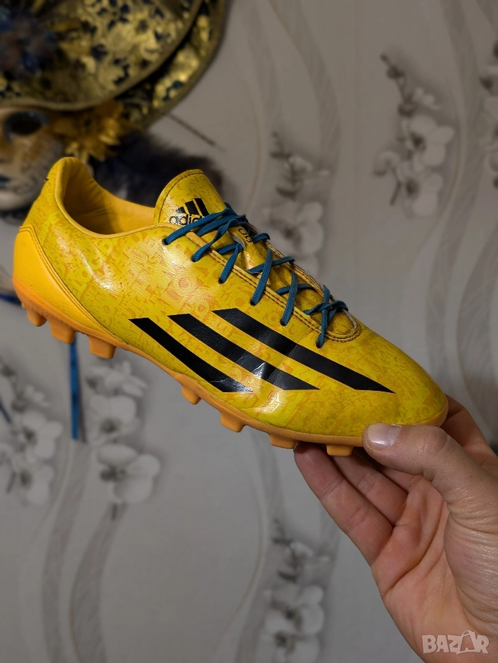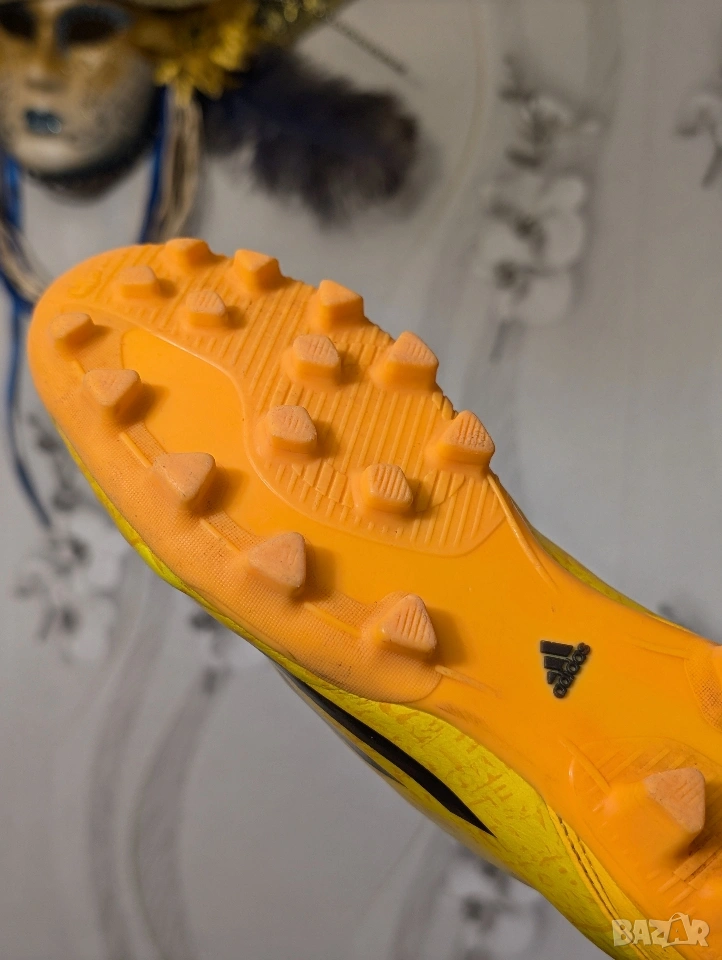 Футболни обувки Adidas F50 adizero-Messi (синтетични) за младежи TRX FG (слънчево златисто/черно). Проектирани за един от най-добрите играчи в света, Adidas F50 adizero са любими на Лионел Меси, откакто той искаше да издигне играта си на следващото ниво. Обявен за най-добър играч на Световното първенство това лято, Меси използва намаленото тегло на обувката, което я прави една от най-леките на терена. Висококачествената синтетична горна част комбинира Hybridtouch, супер тънък и лек материал, с Dribbletex, 3D релефна текстура, за да гарантира, че играта ви с максимална скорост е най-добра. Външната подметка SPEEDTRAXION е разработила подравняване на шиповете за максимално ускорение и по-бързи завои.