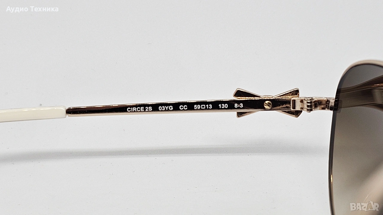 Слънчевите очила Kate Spade New York Circe 2S в цвят 03YG (Light Gold) са дамски модел тип "авиатор", отличаващ се със светлозлатни метални рамки и кафяви градиентни стъкла. Характерен детайл за този модел е декоративният метален елемент под формата на панделка. Технически характеристики Според данни от специализирани търговци като Elite Eyewear Studio и Cool Frames, моделът притежава следните спецификации: Рамка: Метална, пълен обръч, цвят Light Gold (03YG). Стъкла: Кафяви градиентни (Brown Gradient) с 100% UVA и UVB защита. Размери: Ширина на стъклото: 57 мм до 59 мм. Ширина на моста: 13 мм до 15 мм. Дължина на дръжката: 130 мм. Тегло: Приблизително 28.3 грама