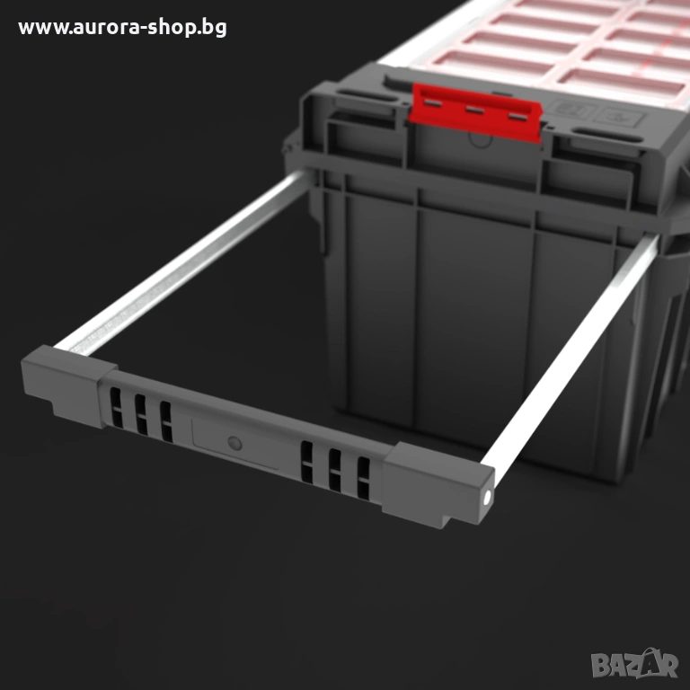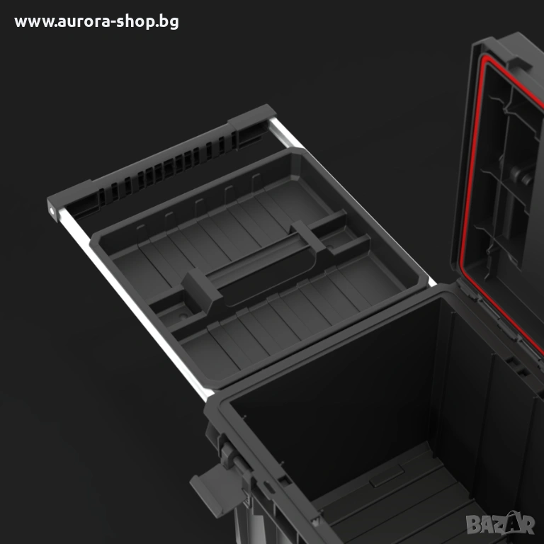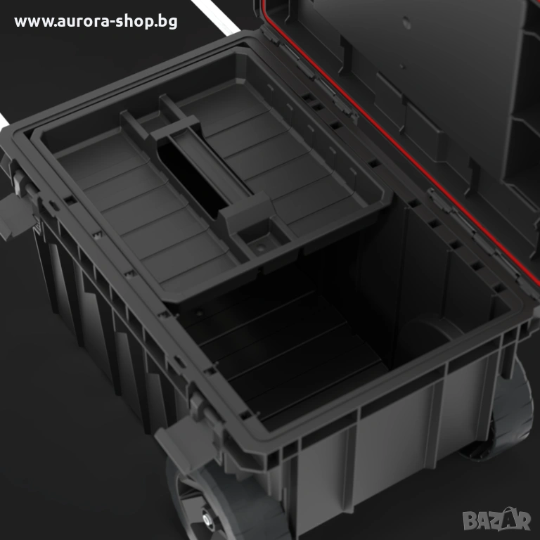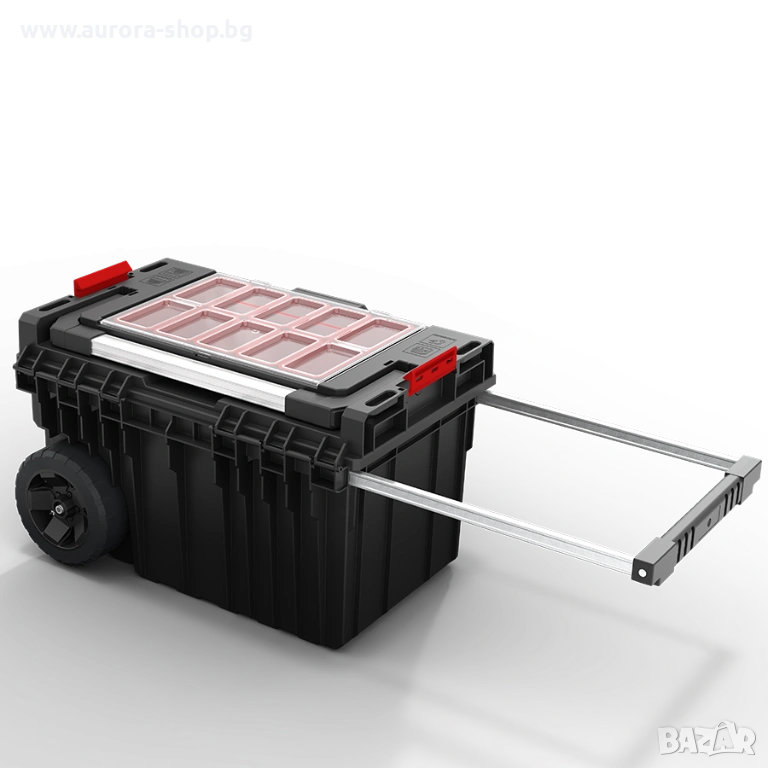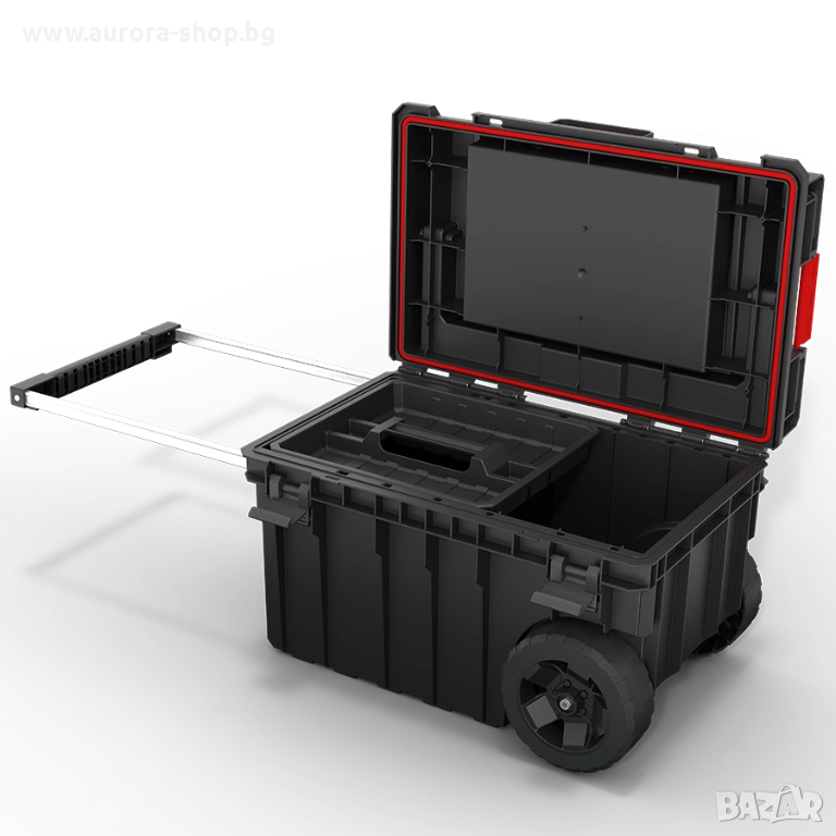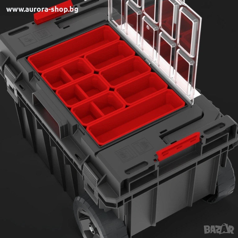 Куфар за инструменти на колела, осигуряващ отлична мобилност на модулните системи Qbrick System ONE. Оборудван е с две устойчиви колела, монтирани на метална ос, което гарантира сигурно транспортиране на свързани кутии и органайзери. Телескопичната алуминиева дръжка, изтегляща се странично, осигурява удобен достъп до вътрешността и комфорт при пренасяне на свързани модули чрез здравите полиамидни конектори. Механизмът на двойната телескопична дръжка се заключва лесно с леко натискане отдолу. Вътрешното пространство включва практична тава и гъвкаво уплътнение за защита от прах и вода. Капакът EXPERT предлага допълнителни възможности за съхранение благодарение на 8 контейнера в различни размери, подходящи както за малки, така и за по-дълги работилнични аксесоари.