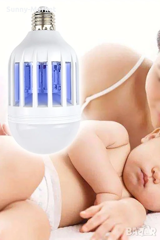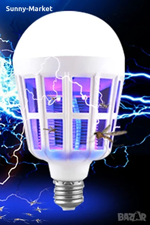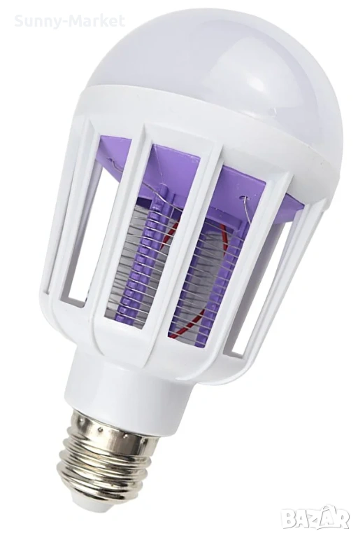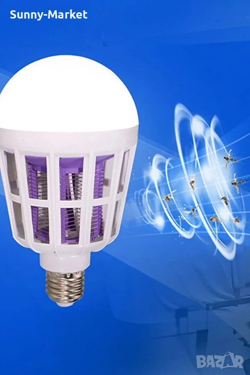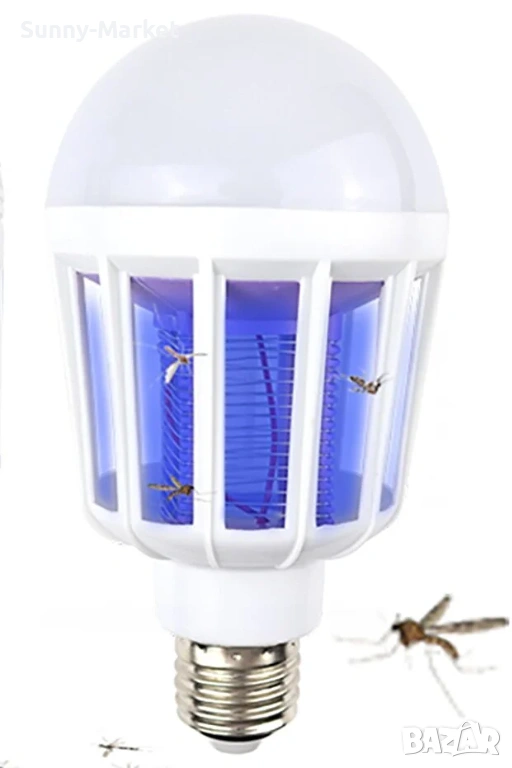 LED крушка против комари с адаптор за стена / Радиус на обхавата - до 20 метра / Волтаж - 220V / Мощност - 15W / Цветна температура - 6500K / Лумени - 1000 / 2 режима на работа - лампа против комари, LED осветление + лампа против комари / Фасунга - тип E27