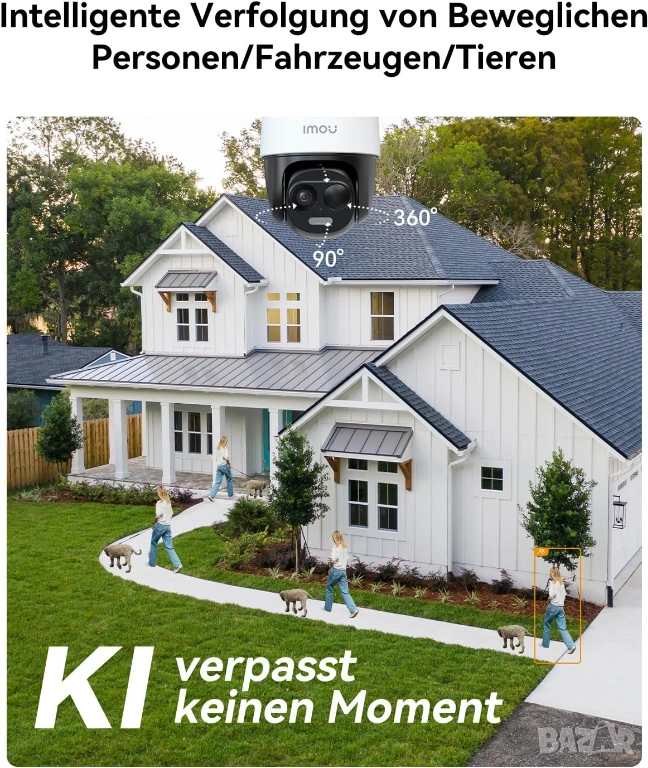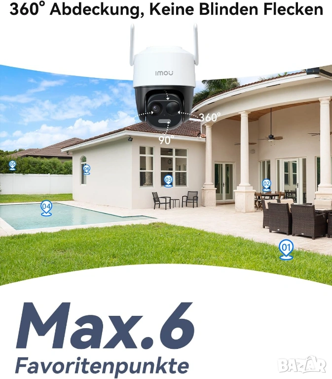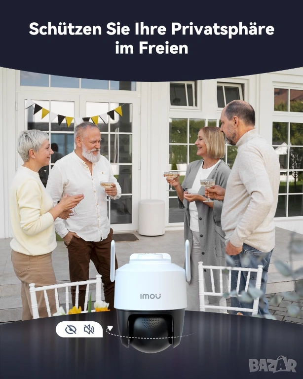 Частен режим и работа с Alexa: Стриймингът се прекъсва с натискане на бутон, за да защити вашата поверителност. Външната соларна камера може да бъде свързана към Alexa и ви показва картина на живо на входната врата, двора или депото, като просто дадете гласови команди на Alexa. Освен това, приложението Imou поддържа смартфон/таблет/компютър.