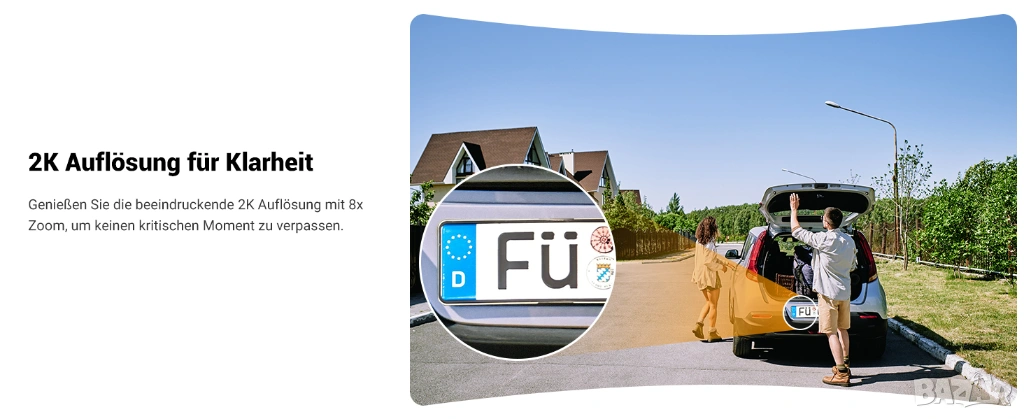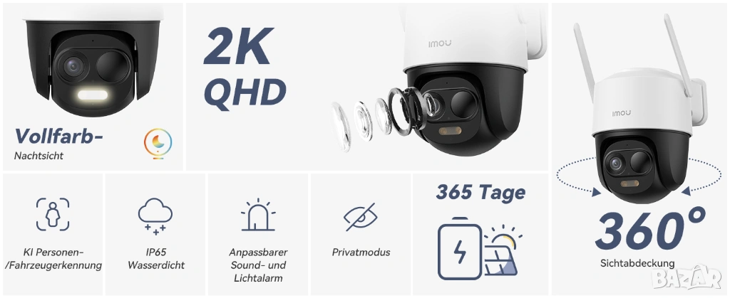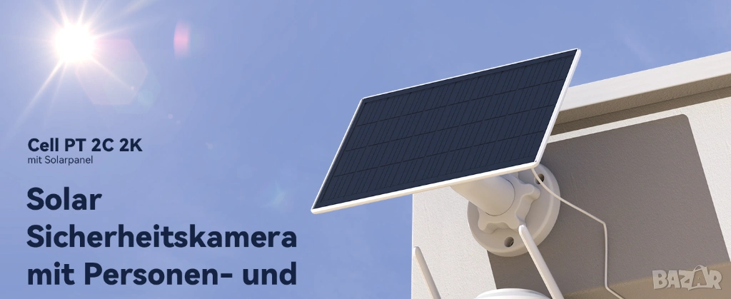 360° PTZ и 2K QHD и 20 м цветно нощно виждане: външната слънчева камера за наблюдение предлага 360° наблюдение без слепи зони. С множество предварително зададени настройки можете да превключвате между ключови ъгли на видимост за секунди. Благодарение на 3MP резолюцията и функцията за 8x увеличение, можете да се насладите на брилянтни, ярки снимки денем и нощем. Обхватът на нощно виждане до 20 м надвишава значително конвенционалните WiFi соларни камери за външна употреба.