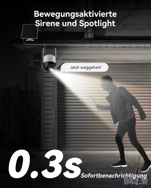 Разпознаване на хора/превозни средства с изкуствен интелект и звукова и светлинна аларма: новоподобрената функция за разпознаване на хора/превозни средства с изкуствен интелект може ефективно да намали фалшивите аларми, причинени от комари/клатене на дървета. Ако подозирате неоторизиран достъп, ще получите незабавно алармени съобщения. Външната слънчева камера за наблюдение активира силни светлини и алармени сигнали, за да запише важни детайли.