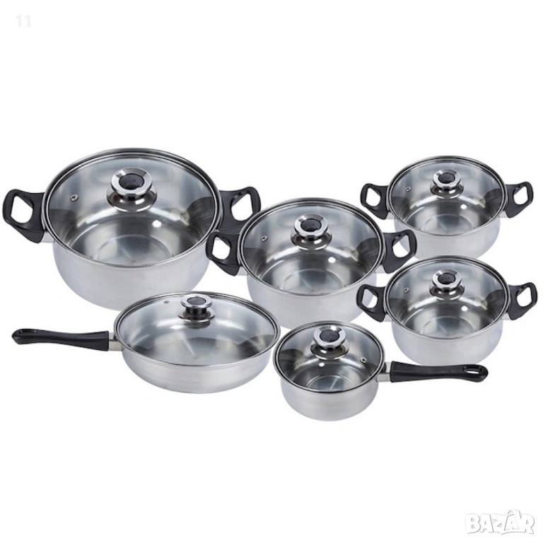 Комплект готварски съдове от инокс 12 части: 5 тенджери, тиган и стъклени капаци (16-24 см) → Обява 53542360