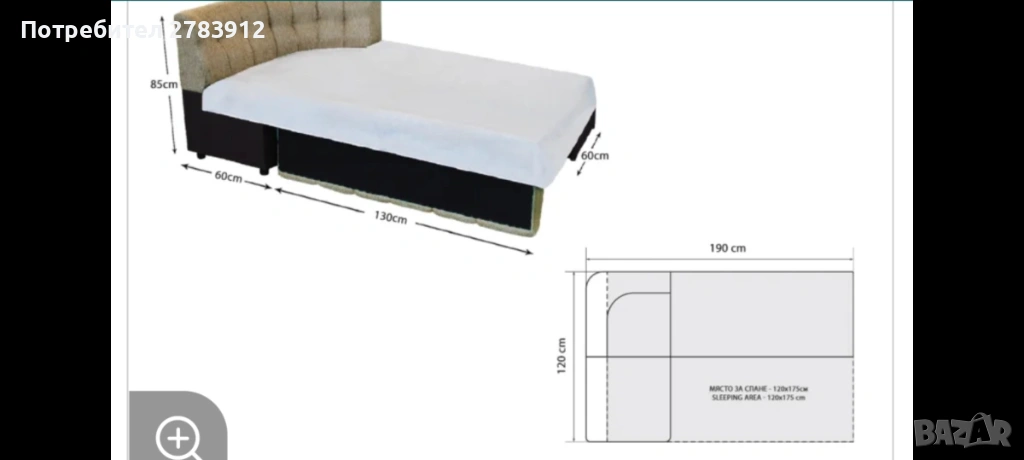 Размерите са 190 см дължина, 45 см ширина на седалището и 85 см височина. При Функция Сън, ширината става 120см. Подходящ за малки кухни, където пространството е ограничено. Изработен от качествени материали, с мека тапицерия и стилен дизайн