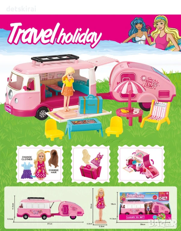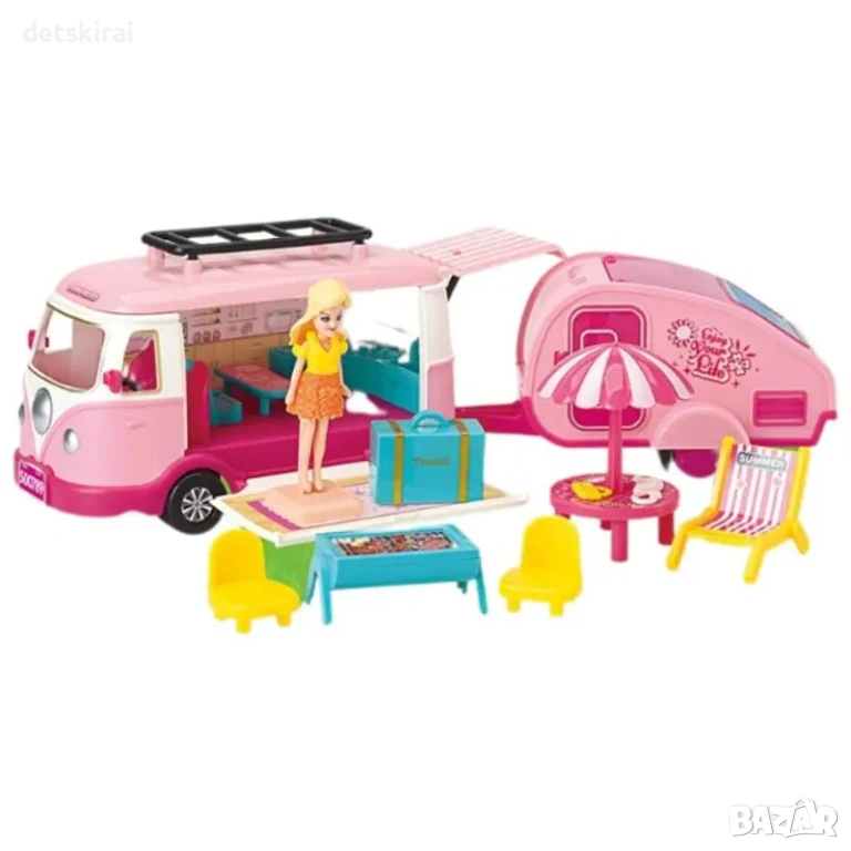 Караваната е изработена с внимание към всеки детайл - от малки прозорци и врати, които се отварят, до интериорни елементи, които извикат истинския дух на къмпингуването. Децата могат да си представят различни ситуации - от пътуване до морето, туризъм или къмпингуване сред природата.