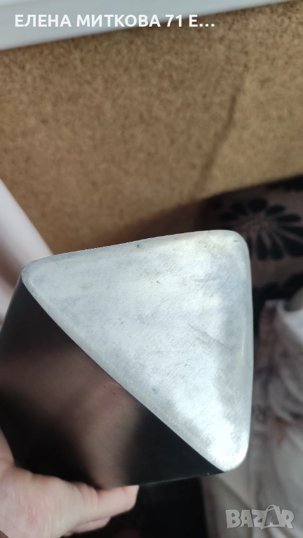 Основата е триъгълник със страна 10 см , която преминава в тясно гърло с диаметър 3 см в горната част