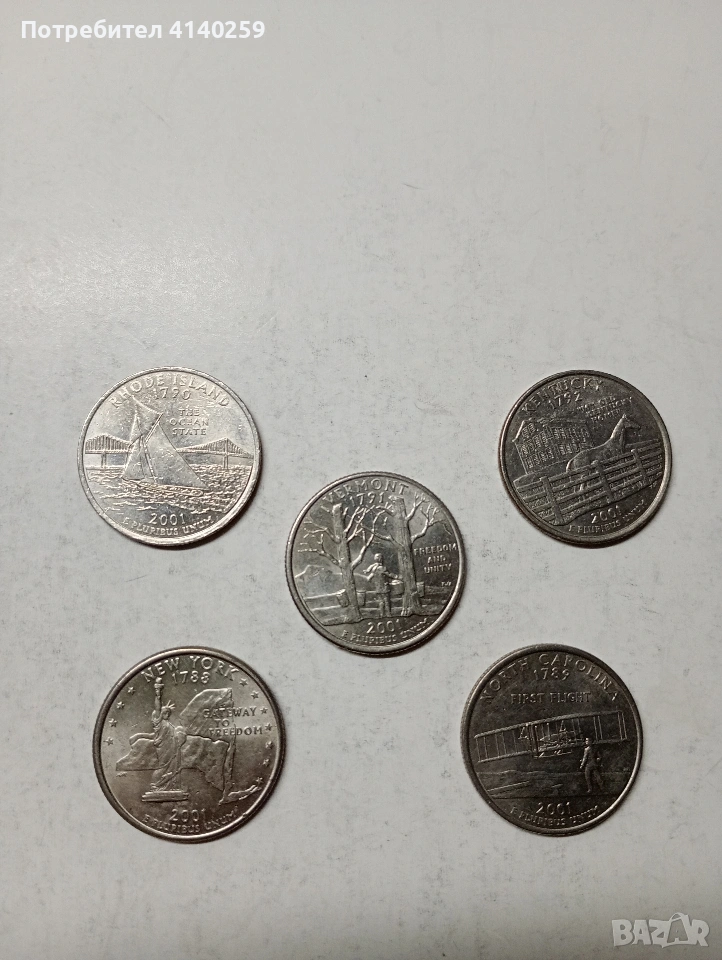 САЩ МОНЕТИ 1/4 КУОРТЪР ДОЛАР 2001 Г 5 ЩАТА РАЗЛИЧНИ НЕЧИСТЕНИ ЦЕНА ЗА 5 БРОЯ СЪСТОЯНИЕ ВИДИМО ПОЛУЧАВАТЕ СНИМАНИТЕ МОНЕТИ РАЗГЛЕДАЙТЕ ДРУГИТЕ МИ ОБЯВИ ДА КОМБИНИРАТЕ ДОСТАВКА ЕКОНТ ЗА ВАРНА ЛИЧНО