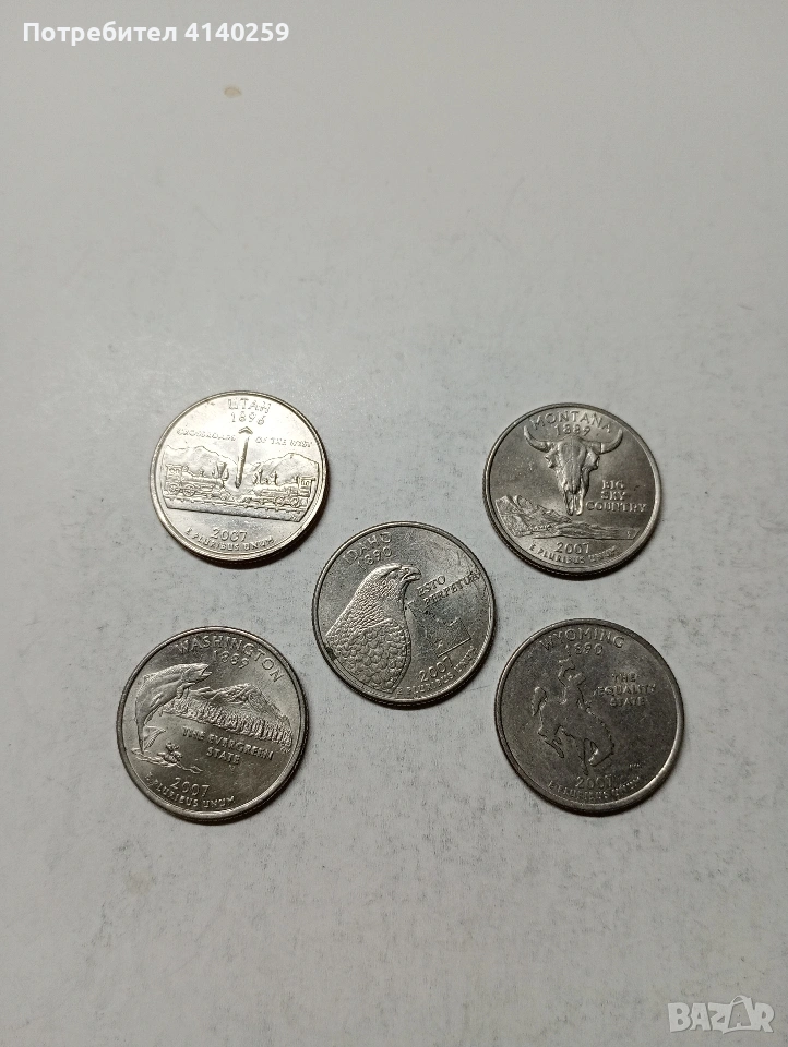 САЩ МОНЕТИ 1/4 КУОРТЪР ДОЛАР 2007 Г 5 ЩАТА РАЗЛИЧНИ НЕЧИСТЕНИ СЪСТОЯНИЕ ВИДИМО ЦЕНА ЗА 5 БРОЯ ПОЛУЧАВАТЕ СНИМАНИТЕ МОНЕТИ РАЗГЛЕДАЙТЕ ДРУГИТЕ МИ ОБЯВИ ДА КОМБИНИРАТЕ ДОСТАВКА ЕКОНТ ЗА ВАРНА ЛИЧНО