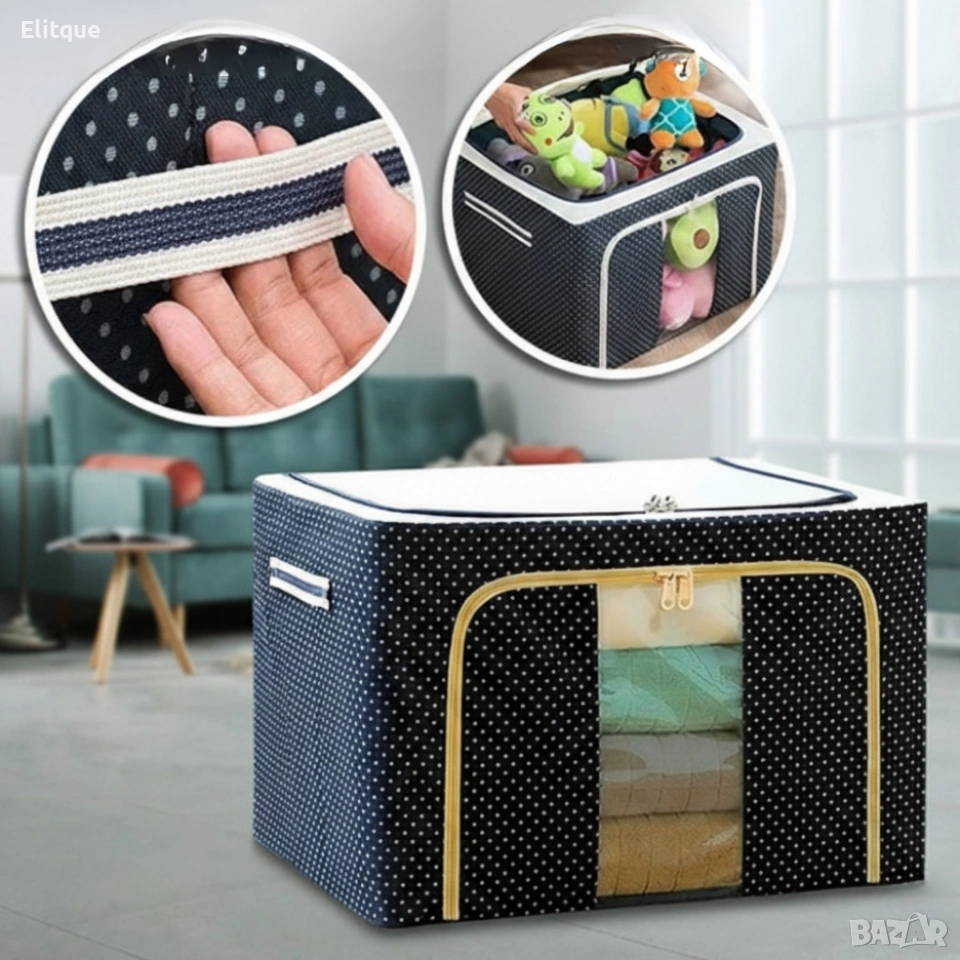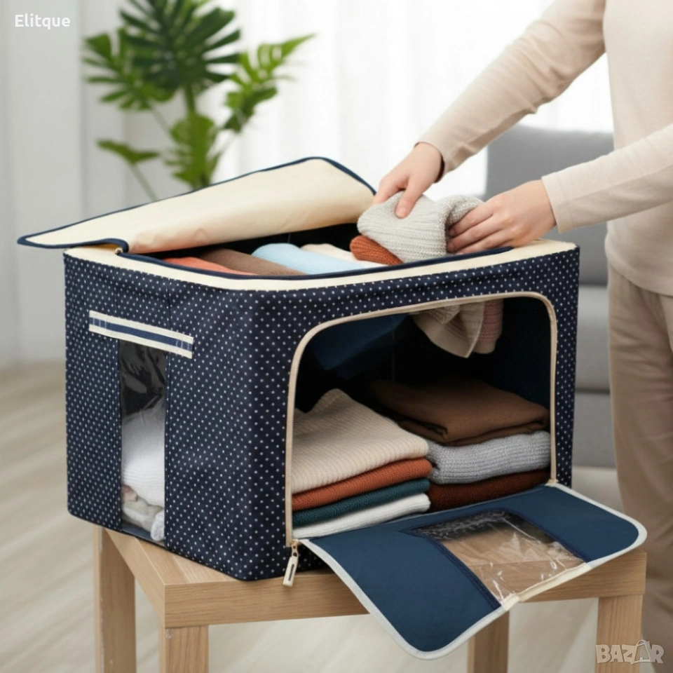 Технически характеристики на Сгъваема кутия за съхранение за подреден дом За по-технически ориентираните потребители ето точните данни, на които можете да разчитате: Капацитет: 66 литра Размери: 52.5 x 42 x 30 cm Материал: 70% полиестер (Оксфорд), 20% фазер със средна плътност, 10% стоманена рамка Цвят: син с бели точки Особености: влагоустойчиво покритие, прозрачни прозорчета, двойни ципове, дръжки, сгъваем механизъм