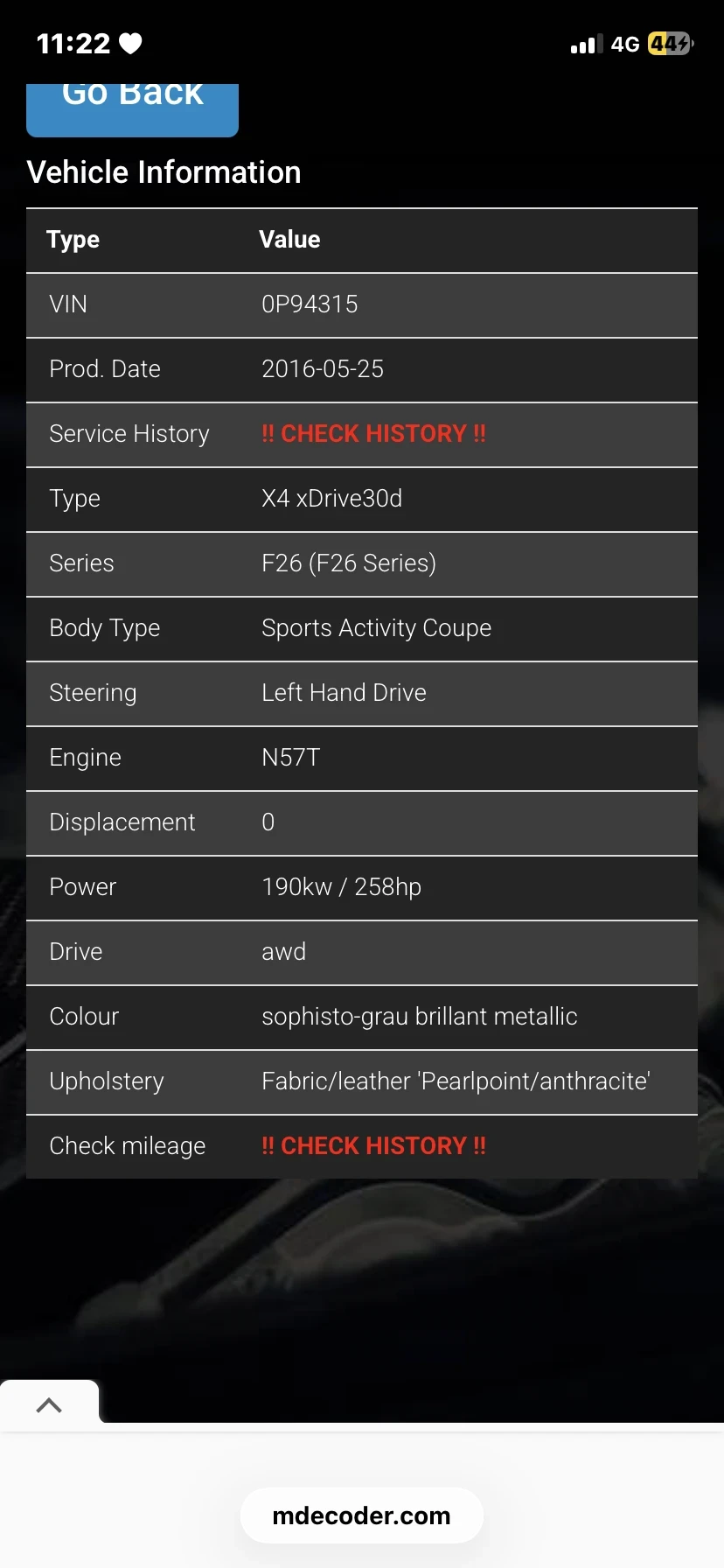 Продава се СПЕШНО без коментар! Каско до април 2026! Пълна сервизна история! ! BMW X4 xDrive 30d 3. 0 TwinPower Turbo 2016 г. , 258 к. с. , регистрирана в България. Автомобилът е оборудван с доказания 3. 0 дизелов двигател (258 к. с. ) в комбинация с 8-степенна автоматична скоростна кутия Steptronic и интелигентна xDrive система. Отлична динамика, стабилност и комфорт при всякакви условия. Пробег: 219 000 км реални, възможност за пълна проверка по VIN. Моделът е с пълен M Sport пакет, който придава агресивна визия и подобрено пътно поведение: M Sport окачване M аеродинамичен пакет M спортен кожен волан M алуминиеви джанти M прагове Таван антрацит Оборудване: Спортен салон кожа/плат Подгрев на предните седалки Навигация Professional с голям дисплей Head-Up Display BMW Adaptive LED светлини Преден и заден парктроник Камера за задно виждане Cruise Control Двузонов климатроник Мултифункционален волан с пера Режими на шофиране (Eco Pro / Comfort / Sport / Sport+) Bluetooth / USB Електрически багажник