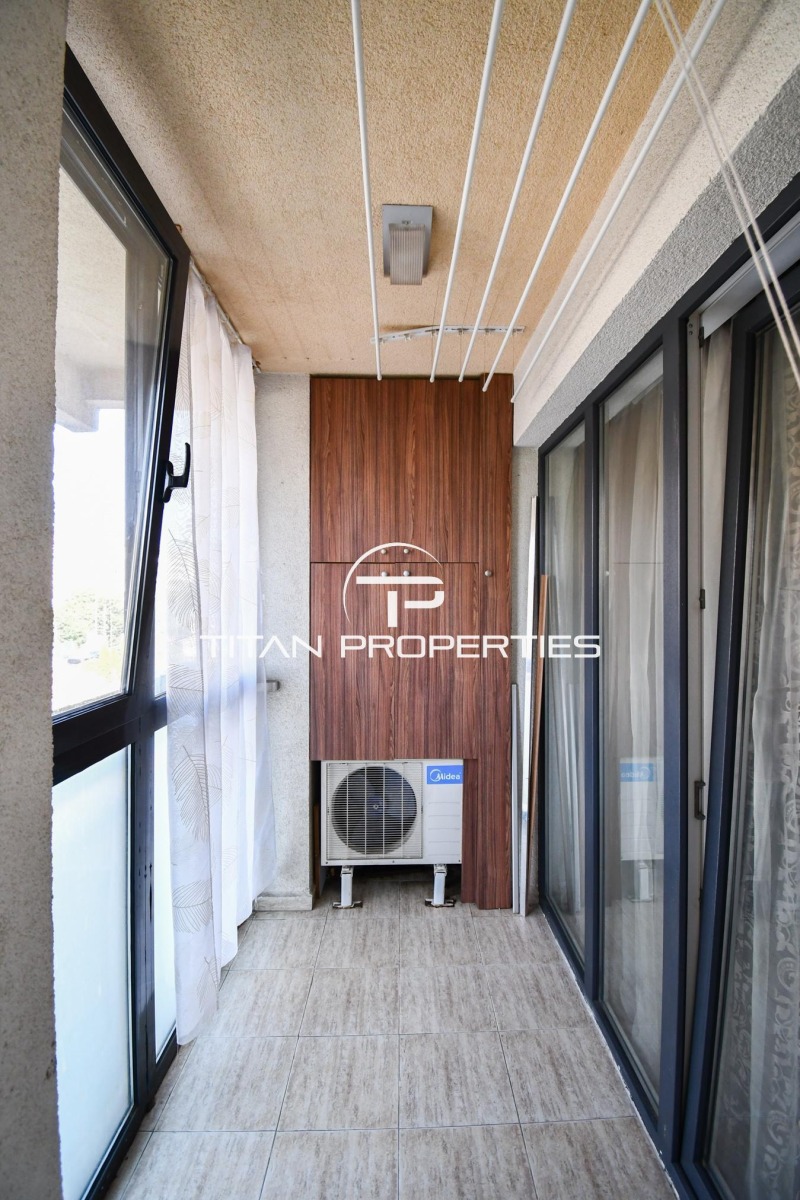 Просторният хол с трапезария и кухненски бокс е свързан с тераса. Предвидена е отделна самостоятелна спалня, баня с тоалетна, помощно помещение (килер) и още една тераса. Апартаментът е обзаведен, оборудван с газово отопление, климатик и интернет окабеляване, а охраната гарантира спокойствието ви. Месечният наем е 670 EUR.