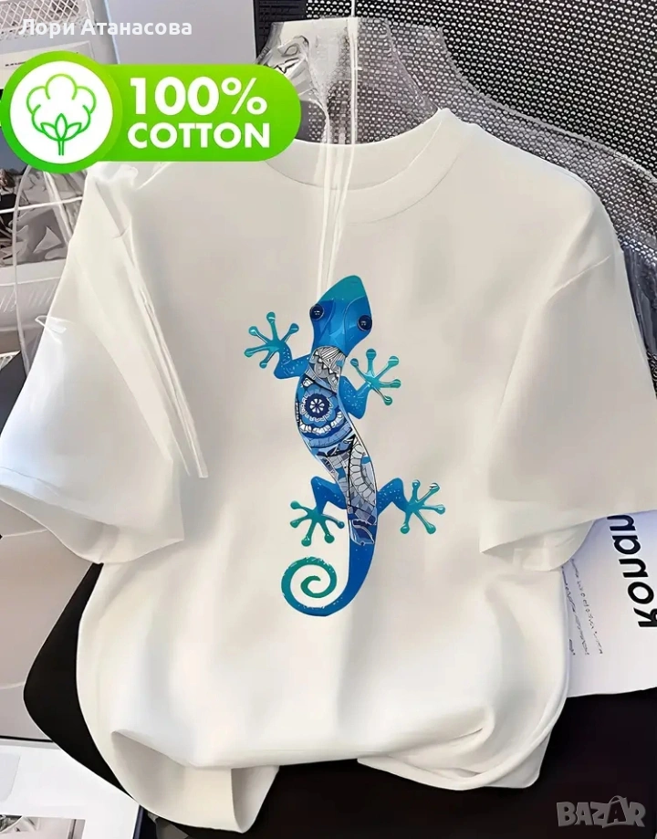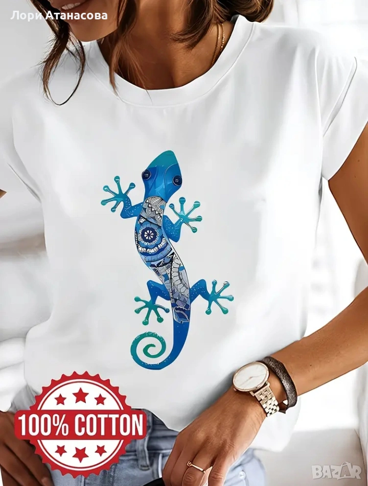 Дамска тениска с принт "Син гекон" - 100% памук, къс ръкав, кръгъл яка, летен топ , снимка 1 - Тениски - 53557444 Дамска тениска с принт "Син гекон" - 100% памук, къс ръкав, кръгъл яка, летен топ , снимка 2 - Тениски - 53557444 Дамска тениска с принт "Син гекон" - 100% памук, къс ръкав, кръгъл яка, летен топ , снимка 3 - Тениски - 53557444 Дамска тениска с принт "Син гекон" - 100% памук, къс ръкав, кръгъл яка, летен топ , снимка 4 - Тениски - 53557444 1/4