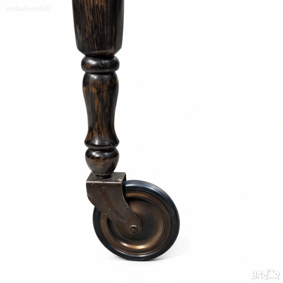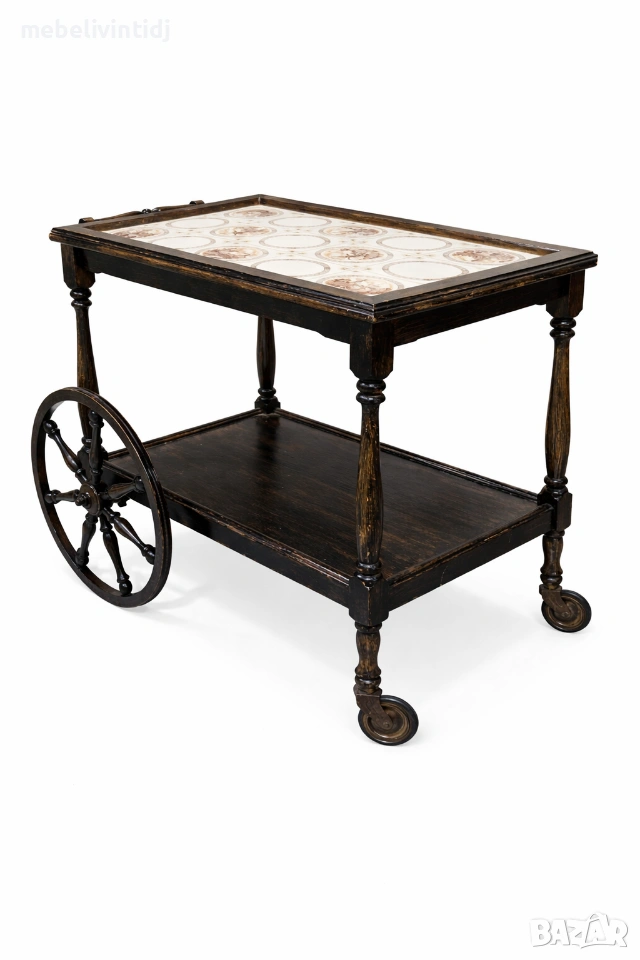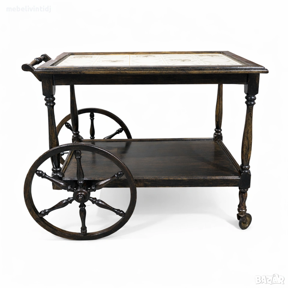 Антична сервираща количка за чай и напитки. Елегантна антична количка в класически стил, изработена от масивно дърво с декоративен плот от керамични плочки и оригинални колела. Отличава се със стабилна конструкция, красив запазен финиш и практично пространство за сервиране. Подходяща за стилен интериор, ретро атмосфера или ценители на антикварни мебели Отлично запазено състояние Ширина – 78 см. Височина – 65 см. Дълбочина – 48 см.