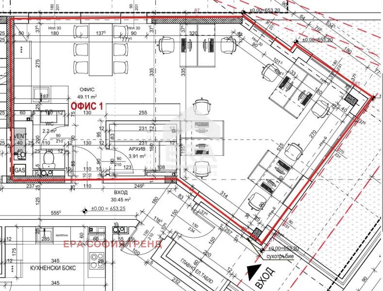 Офисът е с чиста застроена площ от 67,22 кв.м и обща площ 76,45 кв.м. Разпределението включва просторно open space помещение (49,11 кв.м), допълнително помещение, подходящо за архив или склад (3,91 кв.м), както и санитарен възел (2,20 кв.м). Имотът предлага функционална вътрешна организация, лесен директен достъп от улицата и отлична видимост както от пешеходния, така и от автомобилния поток. Тези характеристики го правят изключително подходящ за офис, представителство, студио, консултантска дейност или друг тип търговско предназначение.