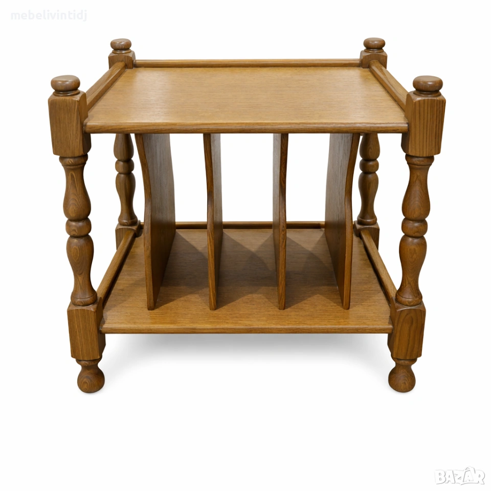 Класическа дървена поставка за винилови плочи или списания в елегантен ретро стил. Разполага със стабилна конструкция, удобни отделения за подреждане и допълнителен горен плот за декорация или съхранение. Подходяща за хол, кабинет или музикален кът. Красива естествена визия.