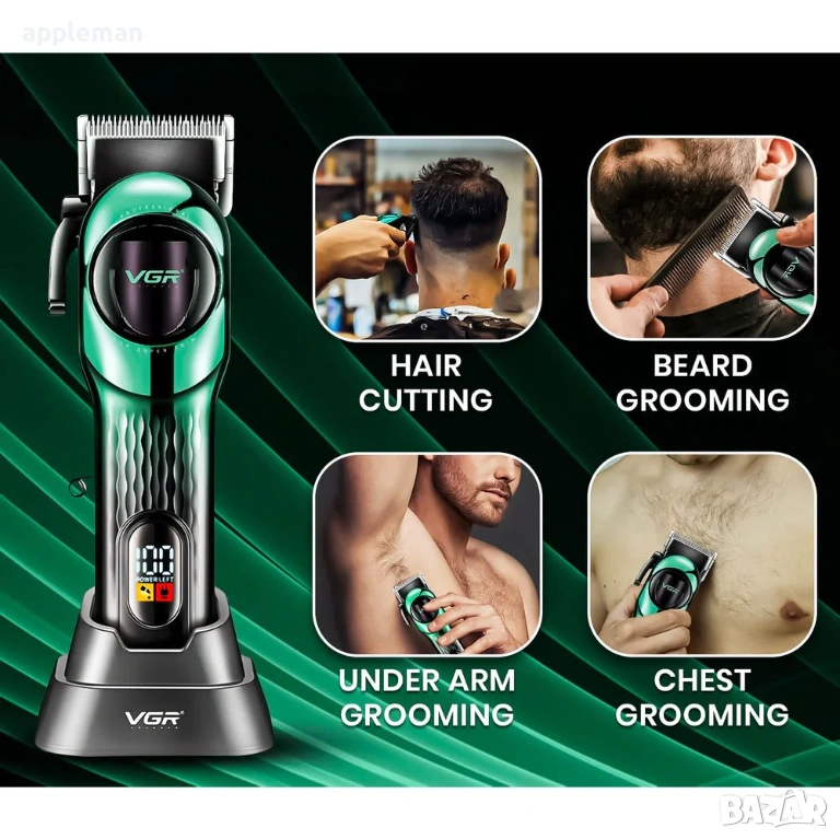 Професионална машинка за подстригване в зелено и златисто. Модел VGR V-166, със стилно и качествено изпълнение. Нова.