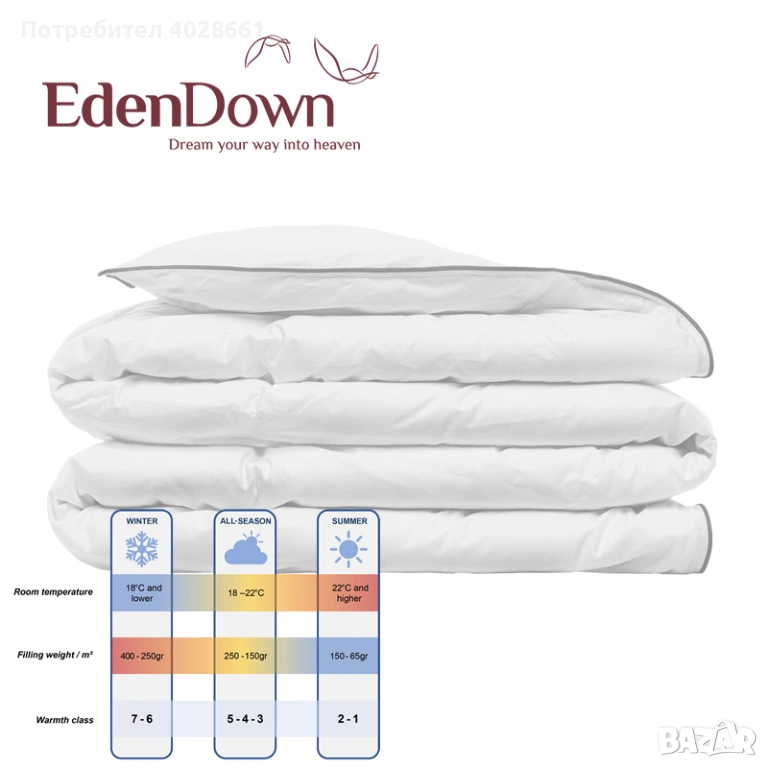 Пълнеж: 70% нов бял европейски патешки пух, 30% меки патешки перца