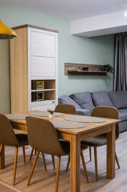 Имотът е обзаведен, с площ 65 кв.м, на 1-ви от 4 етажа в сграда с асансьор. Разпределението включва входно антре, дневна с кухня и трапезария, спалня, баня с тоалетна и тераса.