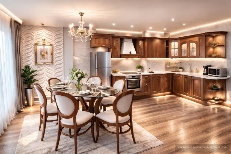 Имотът е ситуиран на 5-ти жилищен етаж и разполага с площ 180кв.м, разгърната в следното разпределение: входно антре, хол с трапезария и кухненски бокс, 4 спални, баня с тоалетна и просторна тераса.