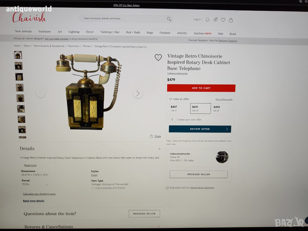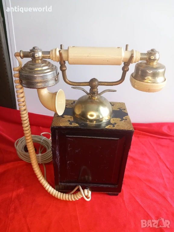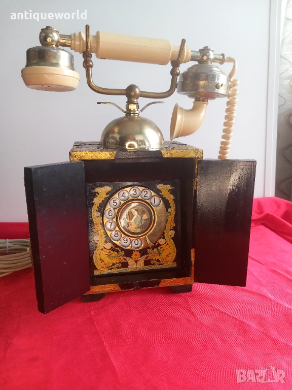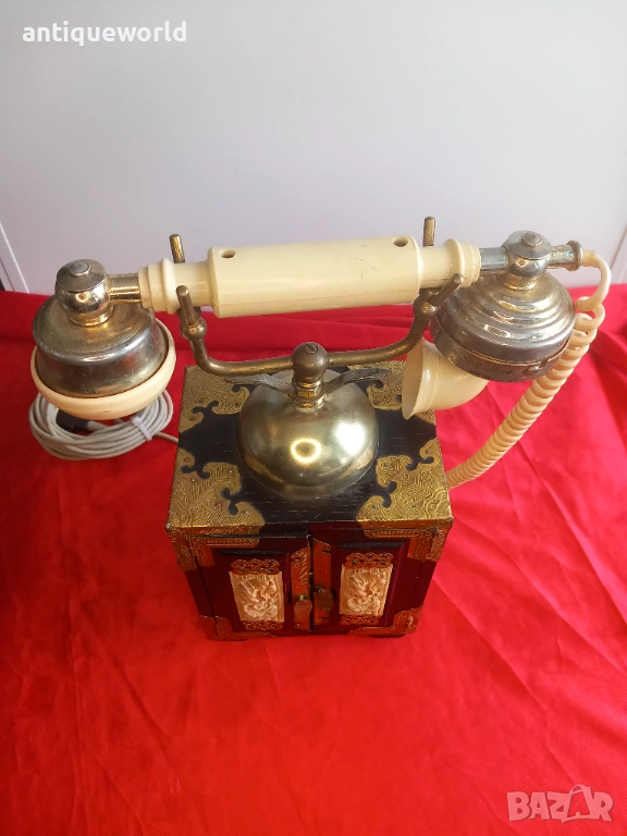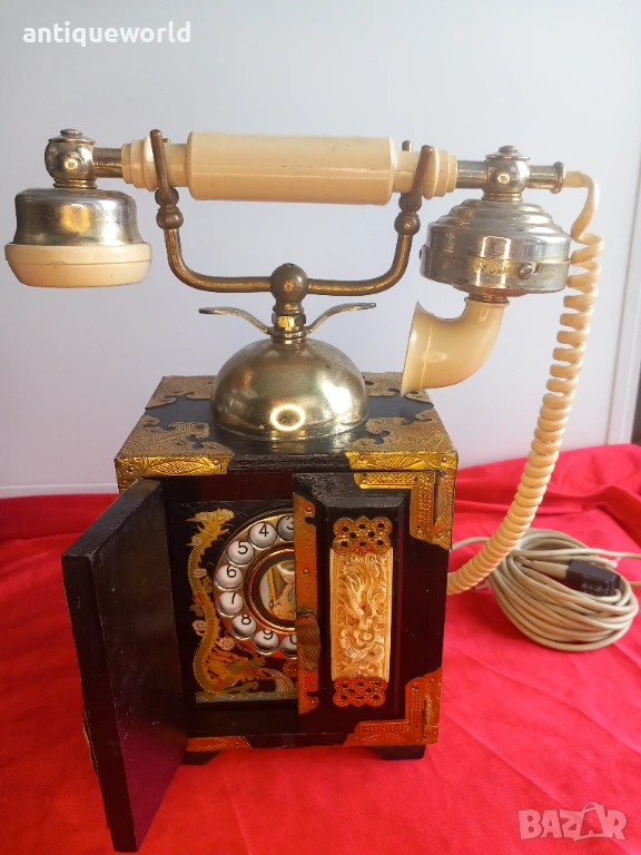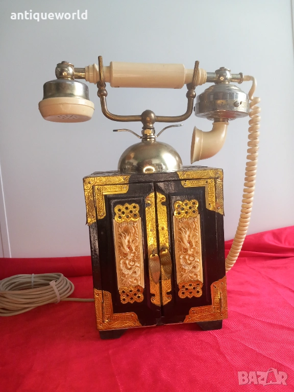 Уникален Стар Голям Масивен Много Красив Настолен ,Стационарен Телефон стил Мандарин от 1960-те.Тип Старинен Китайски Дървен Шкаф, Украсен с Невероятни Месингови Елементи и Кост с Изображения на Дракони.