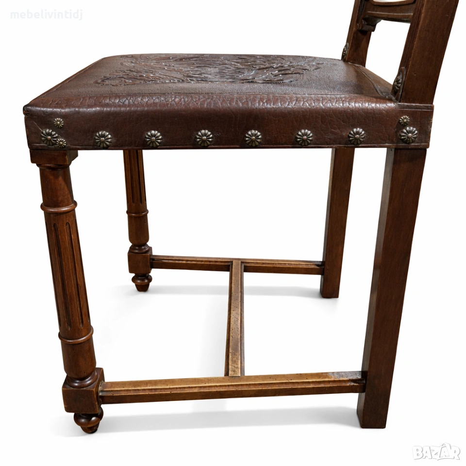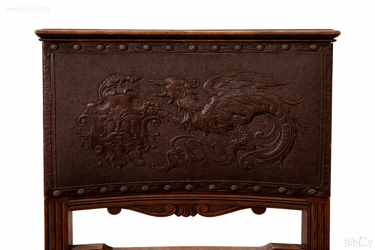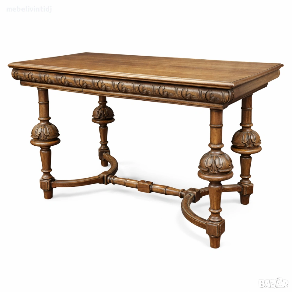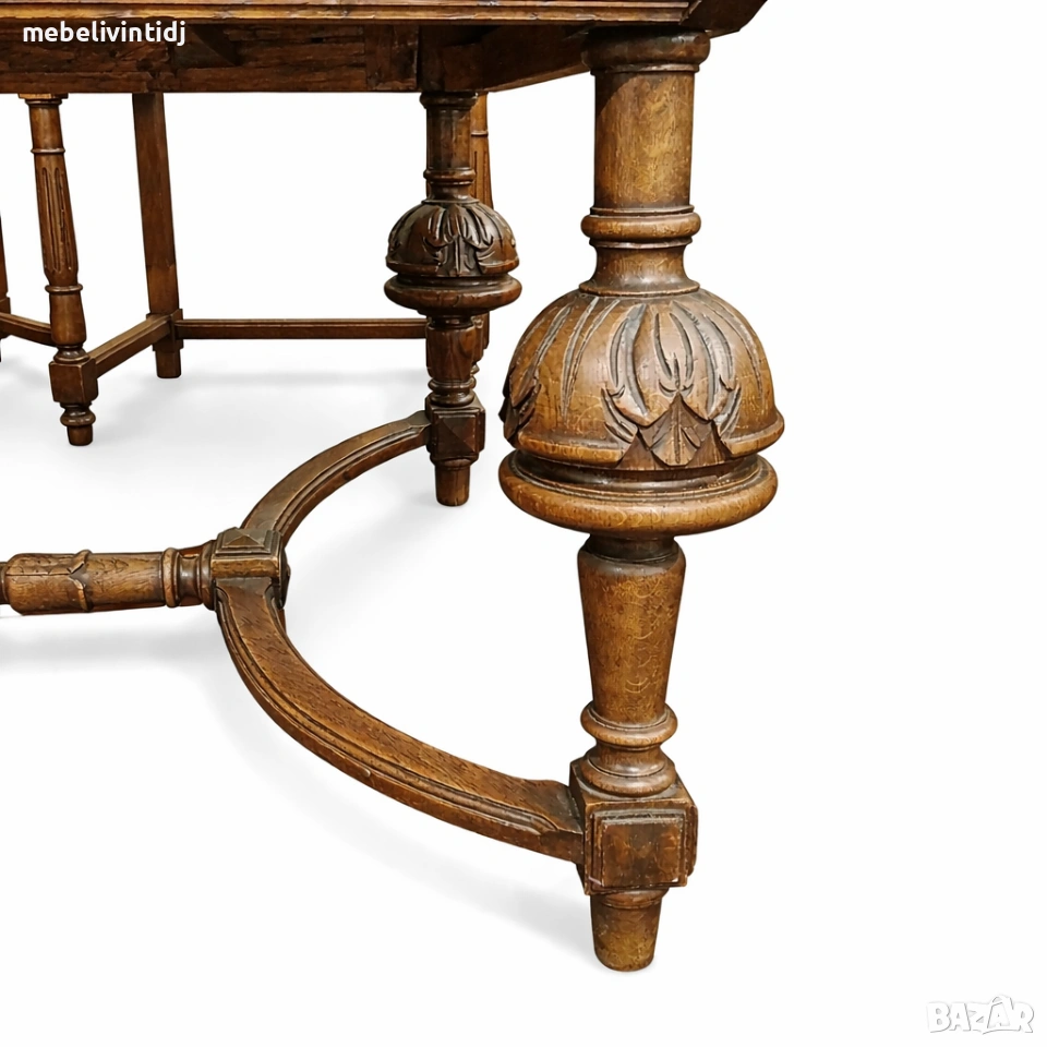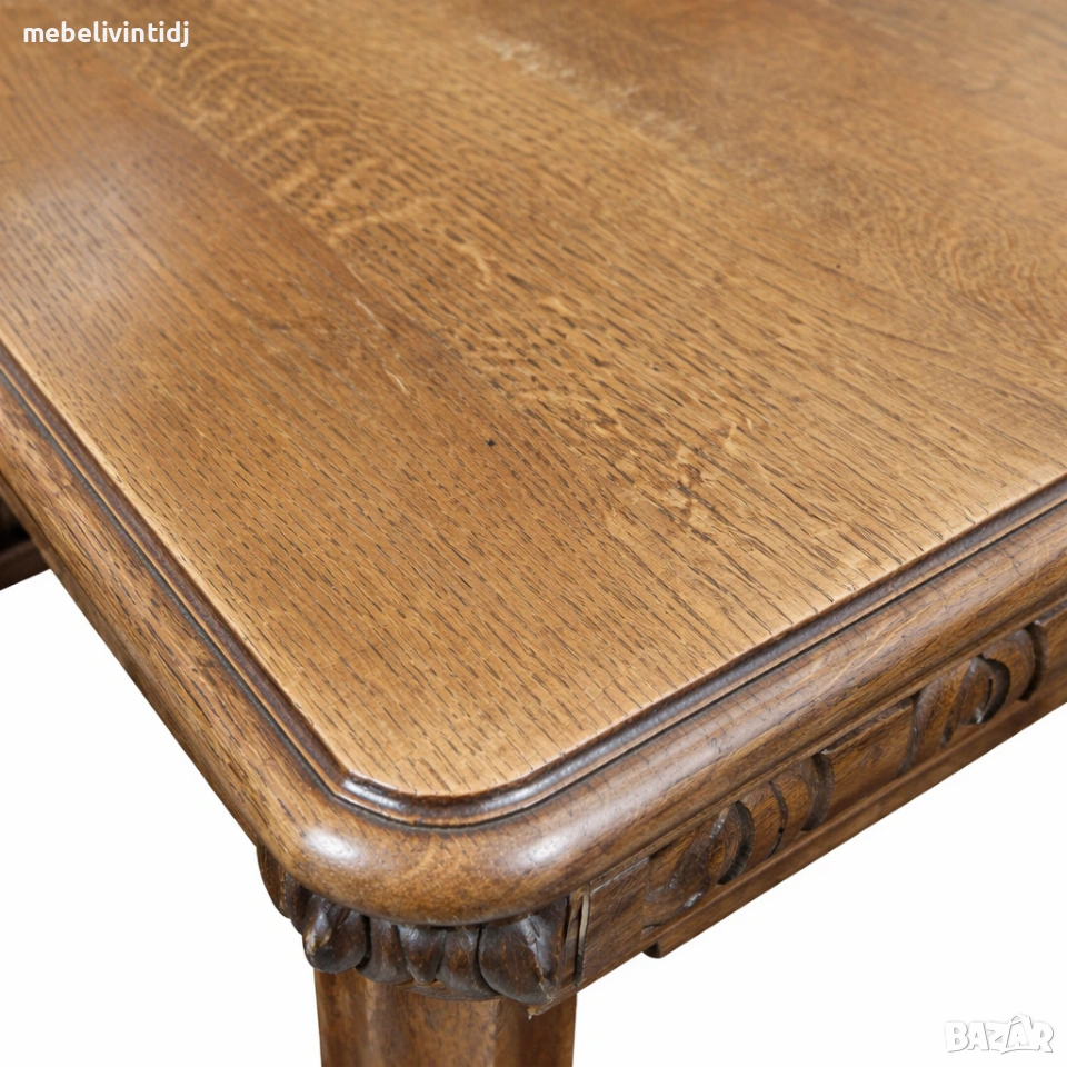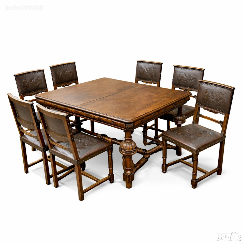 Антикварен трапезен комплект от масивен дъб – впечатляваща маса с ръчно резбовани детайли и съответстващи столове в класически стил. Изящната изработка, здравата конструкция и автентичният характер го превръщат в отличен избор за стилен дом, ресторант или колекционер.