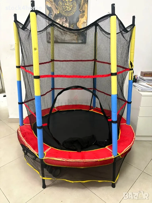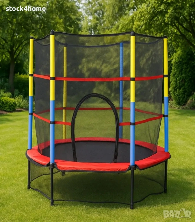Яркият червен кант на предпазната подложка създава привлекателен и весел външен вид, който веднага грабва детското внимание. Колоните са покрити в контрастни жълти и сини уплътнения, които освен естетика, служат и за допълнителна безопасност при допир. Вътрешната мрежа е изработена от плътна синтетична тъкан, която не ограничава видимостта, така че родителите лесно да наблюдават играта. Общият дизайн е съобразен с ергономията и стабилността, като прави продукта подходящ за помещения и открити пространства, където детският батут за деца и детски аксесоари за игра са в центъра на вниманието.