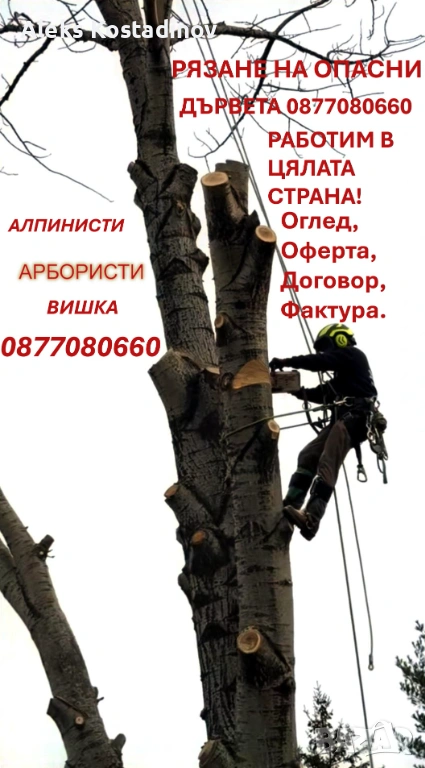 МИНЕРВА АРБО ЕООД- разполага с екип от сертифицирани професионалисти катерачи арбористи за рязане и кастрене на опасно високи дрвета в трудно достъпни места , тесни дворове и тежки терени. РАЗДРОБЯВАНЕ И ИЗВОЗВАНЕ! ОГЛЕД (може онлайн), ОФЕРТА, ДОГОВОР, ФАКТУРА! Работим в цялата страна!!!