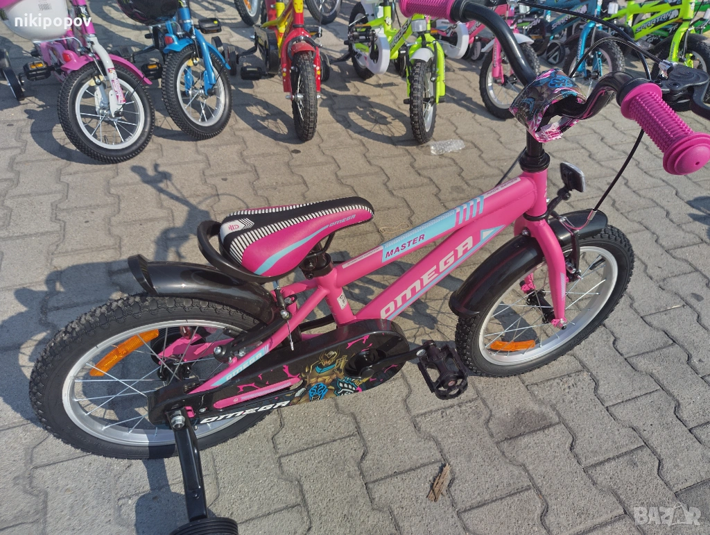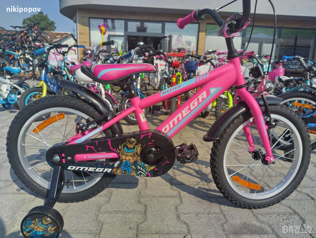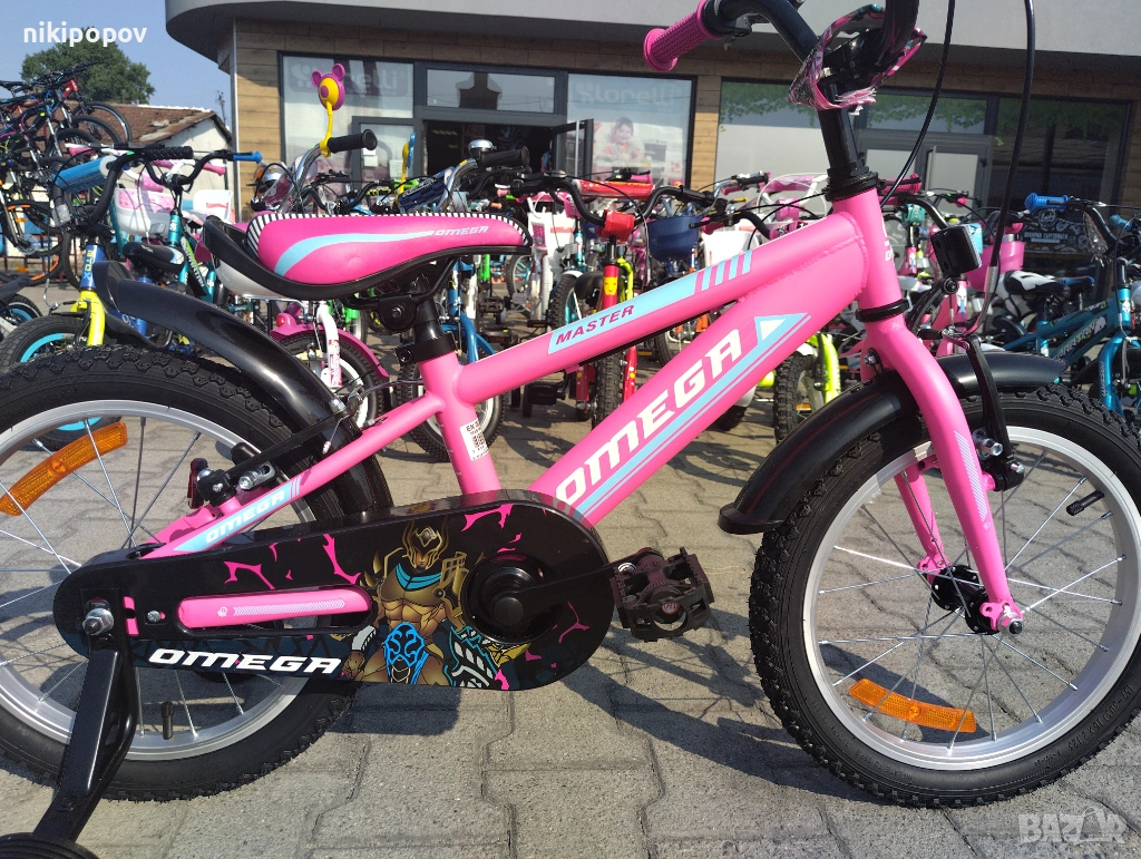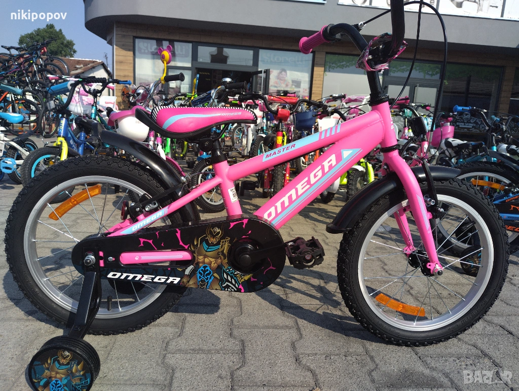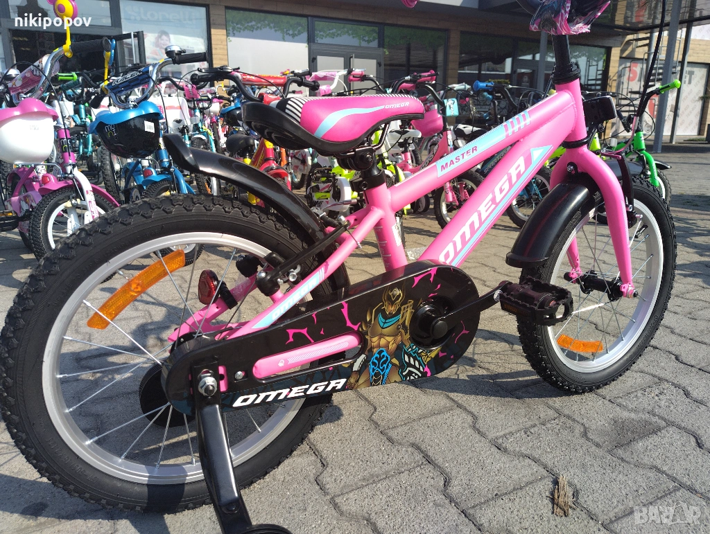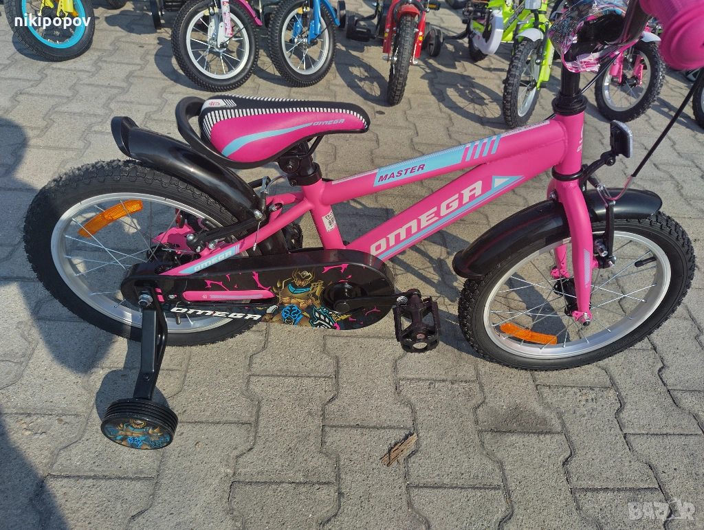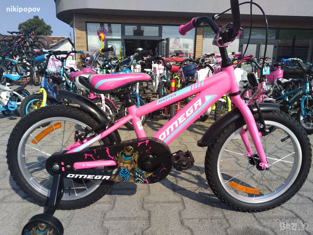 *Детският велосипед на Omega Bikes е един прекрасен избор за децата между 4 и 6-годишна възраст и височина от 100 до 120см. Возилото е снабдено с помощни колела, посредством които детето ще усъвършенства умението си да балансира на две гуми неусетно. Рамката е метална. Велосипедът е с алуминиеви капли. Разполага с предна и задна V-brake спирачка, пластмасови калници и предпазител на веригата.