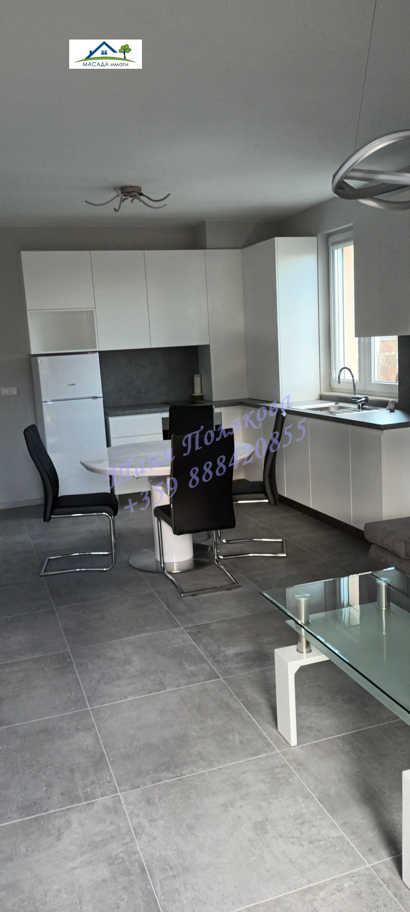 На Вашето внимание уважаеми кандидат-наематели предлагаме:слънчев, уютен непреходен тристаен апартамент разположен в нова сграда с контролиран достъп.Сградата се намира в местността 'Камбаните'на ул.'Бяла река' с бърз излаз на Околовръстен път сред нови сгради и затворени комплекси.Жилището е с ново обзавеждане и оборудване.Предлага дневна с кухненски бокс с прозорец и излаз на южна тераса, баня с тоалетна и отделна тоалетна, две самостоятелни спални.Към имота има голямо мазе, подземен гараж и отделно външно парко място т.е.място за две коли.Ниски разходи за издръжка, отлични общи части и не високи такси за входа.Организирана кооперация, малко съседи.Собствен двор с детски кът.За повече информация и огледи Таня Полякова 0888420855