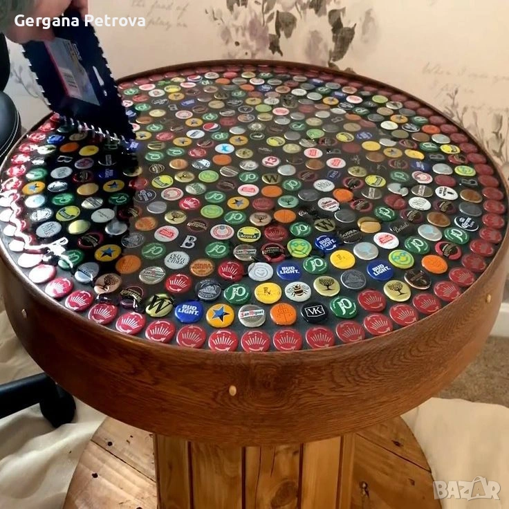 Декорация на мебели: Заливане на капачките с епоксидна смола върху плот на маса или бар