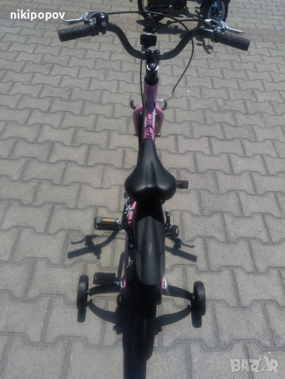 -Детският велосипед е оборудван с помощни колела, звънец и луксозни калници.