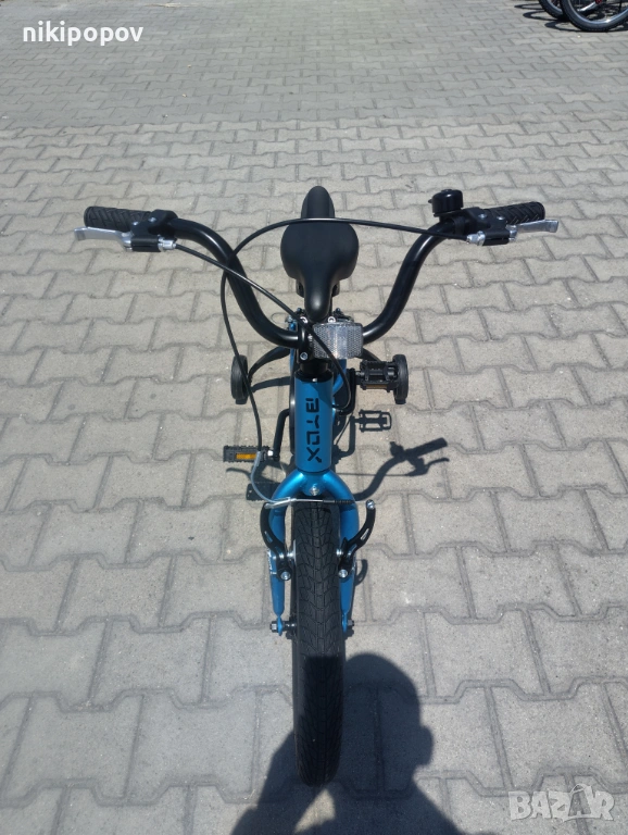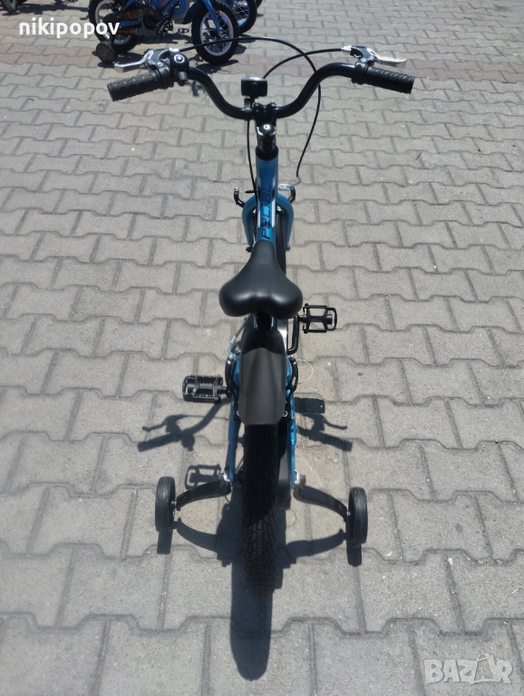 -Детският велосипед е оборудван с помощни колела, звънец и луксозни калници.