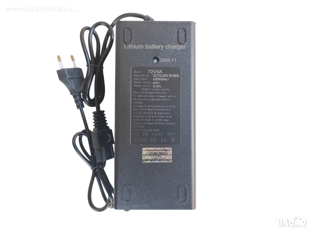 Зарядно устройство 84V (T-type) е подходящо за зареждане на литиево-йонни батерии с напрежение 72 волта. Конекторът e тип “компютърна букса” (T-type), който се използва в електрическите скутери, триколки, инвалидни колички, тротинетки, велосипеди и много други.