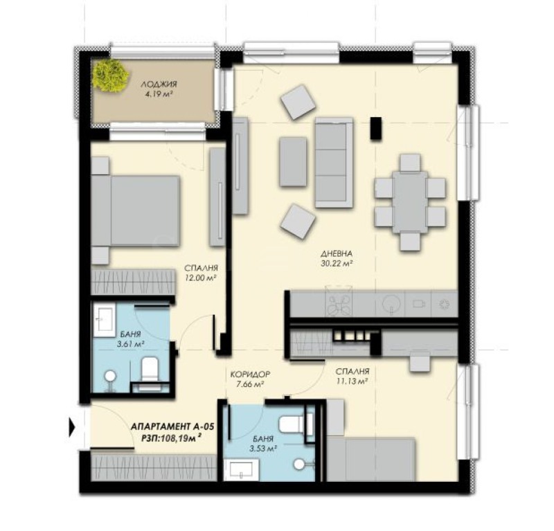 Апартаментът е тристаен, разположен в сграда 1, секция Б, с обща площ 108.19 кв.м. (нетна площ 89.12 кв.м. + общи части 19.07 кв.м.) и е разположен ...