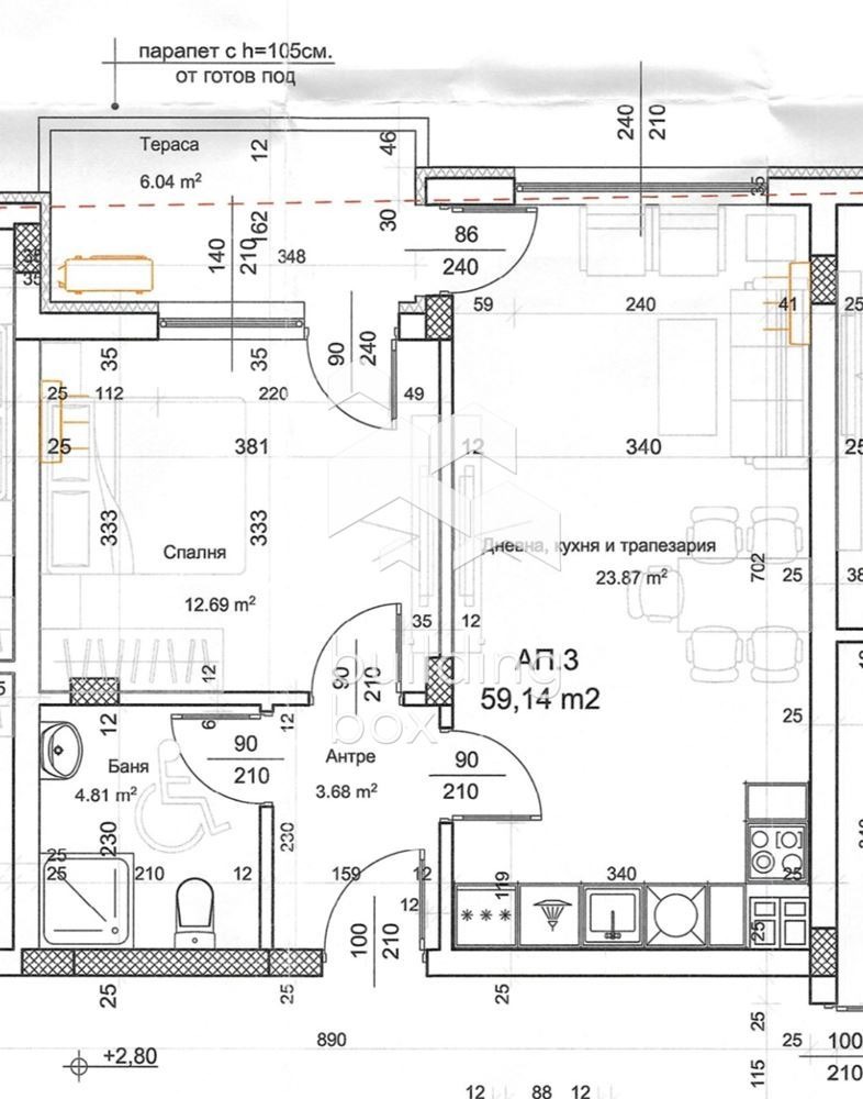 РАЗПРЕДЕЛЕНИЕ: Всекидневна, спалня, баня с тоалетна, входно антре и тераса.