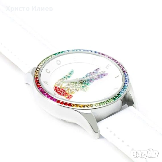 - Бял циферблат с характерно лого на крокодил и украсен с кристали